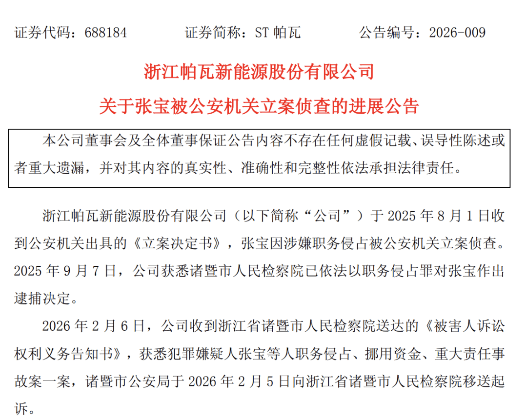 公司核心事件与人物 - 公司首席科学家、前董事长兼总经理张宝通过供应商占用上市公司资金1.41亿元,占用销售货款4991.88万元,合计占用公司资金本金1.91亿元,资金主要用于其个人消费、投资等[3] - 张宝于2025年3月因公司信息披露违规被浙江证监局出具警示函,同年5月辞去董事长、总经理职务[2] - 张宝承诺归还占用资金,但截至2026年1月30日,公司仅收到其归还的3000万元款项[3] - 2025年8月,张宝因涉嫌职务侵占被公安机关立案侦查,同年9月被检察院以职务侵占罪批准逮捕[3] 公司治理与内控问题 - 2025年4月,年审机构对公司2024年度财务报告内部控制出具否定意见的审计报告[4] - 公司因此成为科创板首例因内控问题被实施其他风险警示的企业,股票简称由“帕瓦股份”变更为“ST帕瓦”[4] - 公司存在虚增营业收入、少提存货跌价准备、虚增在建工程、印章使用管理不规范等问题,导致2023年年报及2024年多期定期报告信息披露不准确[2] - 公司已采取管理层换届、完善内控流程、开展合规培训、聘请第三方机构梳理内控等补救措施,但前期内控失效造成的损害和负面影响短期内难以完全消解[4] 公司财务业绩 - 公司近年连续出现亏损:2023年归母净利润亏损2.48亿元,2024年亏损7.27亿元,2025年预计归母净利润亏损5.5亿元至7亿元[7] - 亏损原因包括公司主动优化销售订单结构导致产销量较低,无法有效分摊较高的固定资产折旧等固定成本,以及对部分资产计提减值准备[7] 公司股价表现 - 2025年全年,公司股价累计下跌32.31%[5] - 2026年初至今,公司股价有所回升,累计上涨12.72%[5]