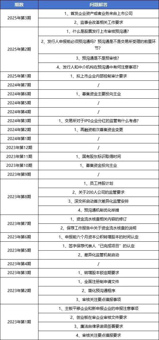 上市审核动态概览 - 深交所发布《深圳证券交易所发行上市审核动态》2025年第3期 自2023年2月全面注册制实施后 原《创业板注册制发行上市审核动态》变更为现名[1] - 2023年至今该审核动态已发布22期 共对29个常见业务问题进行解答[1] 首发企业资产或业务来自上市公司 - 核心情形包括发行人主体曾纳入上市公司合并报表 或发行人取得上市公司部分资产或业务 上市公司分拆上市按专门规则执行[4] - 相关交易需合法合规且价格公允 中介机构需对交易背景、程序、价格及是否损害上市公司利益进行核查并发表意见[5] - 涉及关联交易时 发行人取得控制权至申报时点应运行不少于5年 除非相关资产或业务占比低于10% 若占比超过20% 相关交易行为应接受现场检查[6] 监事会改革与新公司法衔接 - 预计在2026年1月1日前完成上市的在审企业 在审期间可适时完成内部监督机构调整 但上市后须符合要求 并在2026年1月1日前完成调整[7] - 2026年1月1日后新申报或仍在审的企业 需在上市前完成调整 建议在深交所审核阶段完成[7] - 2026年1月1日后 在审企业完成内部监督机构调整的 应在最近一次更新招股说明书中披露 审计委员会和中介机构需重新出具意见[8] - 上市公司进行再融资或发行证券购买资产 应在2026年1月1日前完成公司内部监督机构调整[10] 股票发行上市审核预沟通机制 - 预沟通是发行人或中介机构在提交申请文件前 就重大疑难、无先例事项涉及规则理解和适用问题与交易所进行的咨询沟通[12] - 预沟通是咨询服务而非受理前置条件 市场主体可不经预沟通直接申报 预沟通回复与项目受理及审核结果无关[13] - 预沟通非预审核 交易所仅答复规则理解和适用问题 不做实质性判断或保证[14] - 预沟通提起主体包括保荐人、会计师事务所等中介机构及发行人自身 沟通时点原则上在申报文件提交前或相关公告披露后[15] - 预沟通事项应聚焦重大疑难、无先例的规则适用问题 不属于范围的情形包括无实质内容、中介机构应自行核查的问题等[16] 拟上市企业内部控制审计要求 - 拟上市企业自提交以2024年12月31日为审计截止日的申报材料起 需提供会计师事务所出具的无保留意见的财务报告内部控制审计报告[17][18] - 已在审的拟上市企业应在更新2024年年报材料时 提供上述内部控制审计报告[18] - 会计师事务所需严格遵照相关审计指引实施审计 提高内部控制审计质量[18] 再融资募集资金投向主业要求 - "现有主业"原则上以披露再融资方案时点为基准认定 指有收入规模、成熟稳定的业务 募投项目涉及新业务需审慎论证[19] - 案例显示 业务收入绝对金额较大且逐年增加、呈现稳定发展趋势可认定投向主业 收入金额小、占比低且协同性弱则难以认定[19][20] - 募集资金投向"新产品"需论证与现有主业的协同性 如为基于现有技术升级或拓展上下游 且生产销售无重大不确定性可认定投向主业[21][22] - 募投项目实施需结合行业特点、技术储备、研发进展等论证无重大不确定性 新产品原则上应完成中试或达同等状态[23] IPO企业分红监管 - 交易所加强对拟上市企业上市前突击"清仓式"分红行为的监管 引导企业承诺在审期间不进行现金分红[24] - 明确突击"清仓式"分红标准 报告期三年累计分红金额占同期净利润比例超过80% 或比例超过50%且金额超3亿元同时补流还贷比例高于20% 将不允许发行上市[24] - 要求保荐人就IPO企业最近三年是否存在突击"清仓式"分红进行重点核查并提交专项报告[24] 再融资前次募集资金变更 - 上市公司申请再融资 对于超过五年的前次募集资金用途存在变更的 需在募集说明书中披露变更所履行的程序[25] - 中介机构需在发行保荐书等文件中对发行人是否符合前募资金变更要求发表明确意见[25] 国有股东标识要求 - 发行人存在国有股东的 需在招股说明书中按规定进行标识并披露依据及含义[26] - 发行人应在申报时提交国有股东标识相关批复文件 在审企业未取得批复的可按新老划断原则推进审核 但提交注册前应取得批复[26] 员工持股计划与股东人数计算 - 首发申报前实施的员工持股计划原则上应全部由公司员工构成 2020年3月1日前设立的员工持股计划含少量外部人员可不清理 计算股东人数时外部人员需穿透计算[28] - 2020年3月1日后设立的员工持股计划含外部人员则不符合要求 清理后按一名股东计算 未清理的需作为普通持股平台按总人数穿透计算[28] 200人公司监管要求 - 股东人数超过200人的未上市股份有限公司 符合相关规定可申请公开发行并在证券交易所上市[29] - 发行人本身为200人公司 其合规性由证券交易所审核并报证监会注册 若其控股股东、实际控制人属于200人公司 需向证监会非上市公众公司监管部申请纳入监管 原则上应在发行人申请文件受理前通过审核[29][30] 差异化监管安排 - 深交所于2023年8月17日首次启动对保荐机构的差异化监管机制 一家保荐机构因人均保荐项目数居前20、撤否率为40% 符合认定情形[30] - 因该保荐机构当时在审项目情况 无符合规定的可抽取项目实施现场督导 故对其延后实施并进行谈话提醒[31] 预沟通机制优化 - 截至2023年8月底 深交所完成140多单预沟通申请 同比增长2.5倍[32] - 优化举措包括明确视频及现场预沟通处理时限、简化身份证明要求、建立撤否企业预沟通机制、增加共性问题公开安排