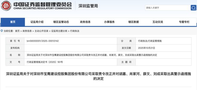 监管处罚与公司回应 - 公司收到深圳证监局责令改正的决定书 指出公司在工程管理、采购管理和资金管理方面的内部控制存在缺陷 [2] - 公司2024年12月关联方现金捐赠的相关信息披露不准确 [2] - 公司时任董事长胡嘉、总经理肖家河、时任财务总监薛文、董事会秘书刘成对上述问题负有主要责任 [2] - 深圳证监局对公司采取责令改正的监管措施 对胡嘉、肖家河、薛文、刘成分别采取出具警示函的监管措施 [3] - 公司被要求在30日内提交书面整改报告 并表示将高度重视问题 及时整改并加强内部控制和规范运作 [4] 公司基本情况 - 公司全称为*ST宝鹰 股票代码002047 成立于1993年4月30日 注册资本约15.16亿元人民币 [4] - 公司注册地址位于深圳市南山区 主营业务为建筑、装饰工程施工及承建管理的一体化综合解决方案 [4] - 公司现任董事长为李鹏 董事会秘书为刘成 员工人数为187人 [5] - 公司实际控制人为珠海市人民政府国有资产监督管理委员会 [5] - 公司参股41家公司 包括广东宝鹰建设科技有限公司、惠州宝鹰精密智造有限公司等 [6] 财务业绩表现 - 公司2024年营业收入为21.12亿元 同比下降48.63% 2025年第二季度营业收入为3.12亿元 同比下降74.35% [6] - 公司2024年归母净利润为-7.42亿元 2025年第二季度归母净利润为-2375.84万元 [6] - 公司归母净利润同比增长率在2024年、2025年第二季度分别为23.52%和89.38% 显示亏损幅度有所收窄 [6] - 公司资产负债率处于高位 2024年为100.46% 2025年第二季度升至102.14% [6] 公司风险状况 - 天眼查信息显示公司自身风险659条 周边风险3109条 历史风险125条 预警提醒风险631条 [6]