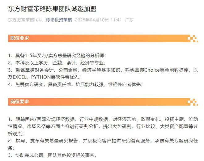 公司人事与团队建设 - 东方财富证券研究所副所长、首席策略官陈果近期发布招聘信息,为其团队招兵买马 [1][2] - 招聘岗位要求应聘者具备1至5年买方或卖方总量研究经验,熟练掌握财务会计、公司金融、经济学等知识,并优先考虑掌握Choice、EXCEL、PYTHON等工具者 [2] - 陈果此前任职于中信建投证券,担任研委会副主任、首席策略官,其原投资策略团队的8名成员目前仍在原公司任职 [5] 公司战略与业务定位 - 东方财富策略研究团队的核心定位是成为面向"AI+时代"的中国股市策略研究引领者,旨在赋能公司各项业务发展 [5] - 公司旗下拥有Choice金融终端,该产品是国内主流的金融数据分析与投资管理软件之一,与万得Wind和同花顺iFinD并列 [5] 市场观点与投资策略 - 首席策略官陈果近期看好内需方向,并将投资微信群更名为“东方财富策略 内需”以反映其关注点 [6] - 陈果认为关税冲击不改其对A股中期逻辑的判断,他依然是中国股市的多头,并建议投资者冷静看待市场波动,当前不是减仓的时候 [6] - 其分析指出,以内需为主的行业(如食品、农业、军工等)受关税影响较小,并可能受益于国内宽松政策 [7] - 随着美联储降息预期升温,无风险利率下行可能提振股票估值 [7] - 财政政策可能进一步发力于基建、地产及服务消费领域,相关板块值得关注 [7] - 陈果在研报中表示,后续内需政策加码概率将显著提升,依据包括央行可能择机降准降息、美联储降息概率提升以及中央财政留有充足的政策空间 [7] - 策略同时关注全球贸易格局重构下的新机遇 [7]