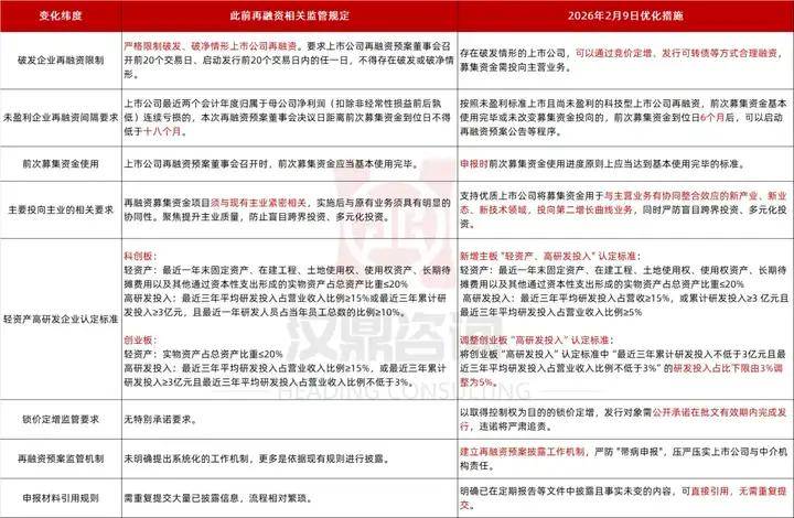 一揽子措施核心政策导向 - 三大交易所于2026年2月9日发布优化再融资一揽子措施,政策导向高度统一,旨在实现“精准滴灌”而非“大水漫灌”,支持优质上市公司与科创企业,引导资源向新质生产力领域集聚,同时坚持防风险、强监管,构建活而有序的市场秩序 [1][3] 支持优质上市公司再融资 - 大力支持经营治理、信息披露规范,具有代表性与市场认可度的优质上市公司,优化其再融资审核,提高再融资效率 [1] - 支持优质上市公司将募集资金用于与主营业务有协同整合效应的新产业、新业态、新技术领域,投向第二增长曲线业务,但严防盲目跨界投资、多元化投资 [1][5] - 允许存在破发情形的上市公司通过竞价定增、发行可转债等方式合理融资,但募集资金需投向主营业务,体现“扶优限劣”导向 [1][5] 支持科创企业及未盈利企业 - 支持按照未盈利标准上市且尚未盈利的科创企业按需、合理实施再融资 [1] - 对于上述未盈利科创企业,若前次募集资金基本使用完毕或未改变投向,前次募集资金到位满6个月即可启动新一轮再融资,间隔期从过去的18个月大幅缩短至6个月 [1][5][7] - 沪深交易所在前期科创板及创业板“轻资产、高研发投入”企业认定标准基础上,研究进一步扩大适用范围,在主板建立“轻资产、高研发投入”认定标准,并放宽募集资金补充流动资金比例限制 [3][5] - 调整创业板“高研发投入”认定标准,将“最近三年平均研发投入占营业收入比例不低于3%”的下限调整为5% [7] 优化审核流程与信息披露要求 - 明确上市公司披露再融资预案时,应简要披露前次募集资金使用情况及下一步计划 [2] - 将前次募集资金应基本使用完毕的时点,从预案董事会召开时调整至申报时,给予公司更大自主权 [5][7] - 上市公司再融资申报材料可引用已公告内容,无需重复提交,北交所进一步明确在审期间若年报、半年报更新财务数据可直接援引,降低中小企业融资操作成本 [2][6][7] - 建立交易所再融资预案披露工作机制,严防“带病申报” [7] 强化监管与压实责任 - 压严压实上市公司信息披露第一责任人和中介机构“看门人”职责 [2] - 对于以取得上市公司控制权为目的的锁价定增,要求上市公司及发行对象公开承诺在批文有效期内完成发行,违诺将严肃追责 [2][6][7] - 加大事中事后监管力度,从严处理再融资违法违规行为,上交所强调将严肃惩处违规变更募集资金用途、擅自延长临时补充流动资金期限等情形 [2]