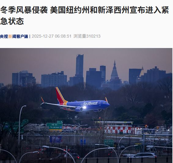 据央视新闻,当地时间12月26日,总台记者获悉,一场强烈冬季风暴正侵袭美国东北部,纽约市、新泽 西州及纽约州北部出行条件迅速恶化。纽约市预计将迎来近四年来最大降雪,降雪量约7英寸。 受风暴影响,纽约州和新泽西州已宣布进入紧急状态。纽约州州长呼吁民众避免不必要出行。 图片来源:央视新闻 此前一天,本次风暴在加州南部引发了大范围洪涝灾害和交通中断,并造成至少两人死亡。包括洛杉矶 县在内的6个县宣布进入紧急状态,超过10万户家庭和商户停电。目前洛杉矶县政府已经向数百户家庭 发布疏散令,这些家庭的住宅位于今年年初野火肆虐的地区,这一地区特别容易发生泥石流。 央视记者获悉,当地时间12月26日,受强烈冬季风暴预警影响,美国出现大范围航班取消和延误,多家 航空公司运营受到冲击。 受风暴影响,美国已有超1500架次航班被取消。恶劣天气主要集中在五大湖地区、北大西洋中部以及新 英格兰南部,对区域航空枢纽运行造成连锁影响。 美国国家气象局26日发布冬季风暴警告称,上述地区将出现降雪、结冰及强风等天气状况,可能导致道 路与航空出行条件显著恶化,相关影响预计持续至27日早间。 另据央视新闻,12月25日,美国加利福尼亚州南部继续遭 ...