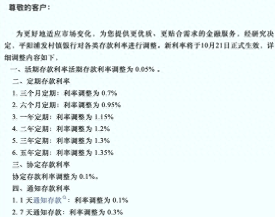 进入10月以来,多家区域性中小银行陆续发布公告,密集下调各类存款利率。 平阳浦发村镇银行网站消息,该行发布公告称,自10月21日起将实施新一轮存款利率调整。相比此前水 平,整存整取定期存款三个月、六个月、一年、两年、三年及五年期产品,分别下调40个、35个、35 个、50个、80个和80个基点。 此外,该行活期及协定存款利率也同步下调。其中,活期存款利率由0.25%降至0.05%,下调20个基 点;协定存款利率降至0.1%,下调45个基点。通知存款方面,1天期与7天期利率则分别下调45个和55 个基点。 同样在近期,汕头湾海农商银行也加入了下调行列。自10月18日起,该行定期存款整存整取三个月、六 个月、一年、两年、三年及五年期年化利率,分别调整为0.95%、1.20%、1.40%、1.50%、1.75%和 1.80%,整体较此前下调15至20个基点。 | 尊敬的汕头海湾农商银行客户: | | | | | | | --- | --- | --- | --- | --- | --- | | 自2025年10月18日(以系统日切时间为准)起,我行将执行调整后 | | | | | | | 的存款利率,现将有关事项公 ...