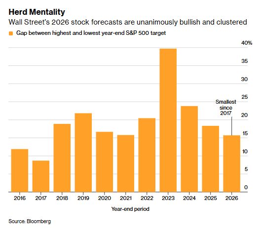 华尔街策略师对2026年美股预测高度趋同 - 华尔街各大机构对2026年标普500指数的预测值处于近10年来最紧密水平,最高预测(奥本海默,8100点)与最低预测(Stifel,7000点)之间的差距仅为16% [1][5] - 策略师们平均预计2026年美股将上涨约11%,尽管美股已连续三年录得两位数回报 [1][6] - 这种高度一致且看好的预测共识引起了部分市场观察人士的担忧,被视为潜在的反向指标 [1][5][7] 看涨与看跌的主要逻辑 - 看涨派的理由包括:经济增长将推动企业盈利,减税和放宽监管将增强经济活力,同时预计美联储将有两次25个基点的降息 [2][7] - 即使是相对悲观的预测(如Stifel的7000点和美国银行的7100点),也意味着较当前收盘价有小幅上涨空间 [2][7] - 悲观派从当前的共识中看到了市场自满情绪,认为预期已被充分定价,市场对边际利空消息将非常敏感 [2][7] 市场共识背后的风险与脆弱性 - 共识展望的逻辑普遍建立在降息、减税和人工智能持续领先等类似基础上,这些预期可能已反映在市场定价中 [2][7] - 当预测高度一致时,市场预期已被充分定价,预测变得脆弱,业绩下滑、政策意外或仓位布局等问题就足以引发市场动荡,无需经济衰退 [2][7] - 由于市场震荡走高,普遍乐观的情绪可能放大外部冲击的影响力 [3][9] 华尔街预测的准确性与性质 - 发布标普500指数预测是华尔街长期传统,但这些预测因经常失准而“闻名” [2][7] - Piper Sandler数据显示,标普500指数的目标价往往比指数的实际表现滞后约两个月,个股目标价也存在类似情况 [2][7][8][9] - 策略师制定的目标价被视为表达看涨或看跌立场的简写,市场走势决定了预测目标,而非预测目标决定市场走势 [3][9] 当前市场面临的宏观风险 - 通胀仍高于美联储的目标,这使得货币政策宽松的预期极易受到打击 [1][5] - 失业率在最近几个月稳步上升 [1][5] - 大规模的人工智能(AI)支出尚未转化为实际收益 [1][5]
