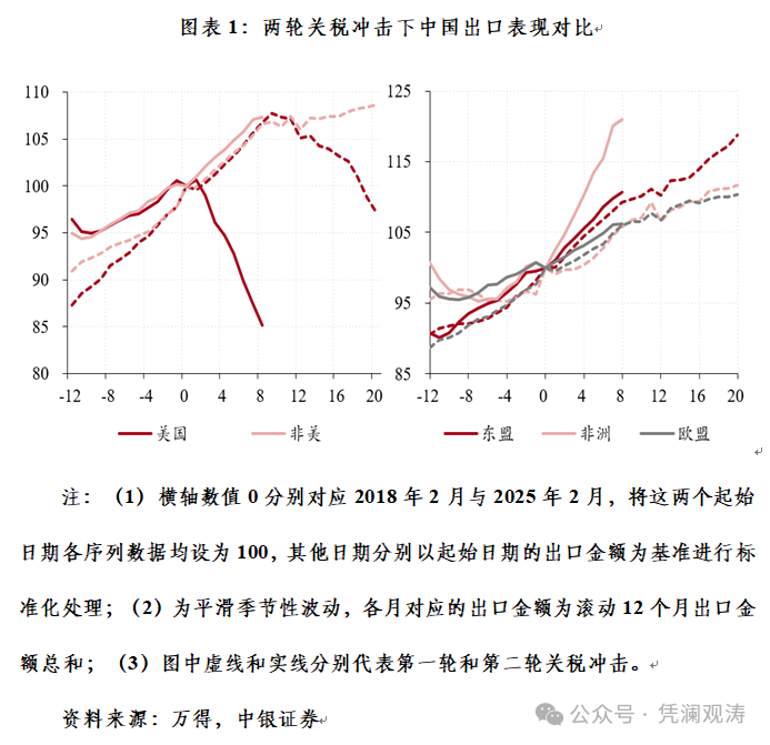 明年中国需警惕世界经济增长动能减弱和对外经贸冲突反复带来的外需扰动。 今年以来,面对特朗普关税政策冲击,全球贸易增长超出市场预期,中国出口韧性尤为显著。根据世界 贸易组织(WTO)最新数据,上半年,中国货物出口占全球出口份额升至14.2%,创下历史同期新高。 那么,在不确定性加剧背景下,中国出口韧性从何而来?本文基于出口目的地、商品结构的分析表明, 中国出口增长背后有供应链调整、制造业转型升级的坚实根基,同时也存在一定隐忧。明年中国需警惕 世界经济增长动能减弱和对外经贸冲突反复带来的外需扰动。 出口市场多元化程度提升 特朗普在第一任期就曾挑起中美贸易冲突,以2018年2月披露232调查结果、3月初对自中国进口的钢铁 和铝产品分别加征25%和10%的关税为开端。今年年初,特朗普重返白宫之后,再次掀起关税风暴。尽 管本次关税冲突范围更广,但作为美国贸易逆差的主要来源国,中国在关税风暴中仍然首当其冲:2、3 月份,美国先后对中国出口商品征收两轮各10%的"芬太尼关税",4月初美国宣布"对等关税",对中国 出口商品征收的关税税率从34%先后提升至84%和125%。直到5月中旬中美在日内瓦举行贸易会谈,双 方宣布同步降 ...
