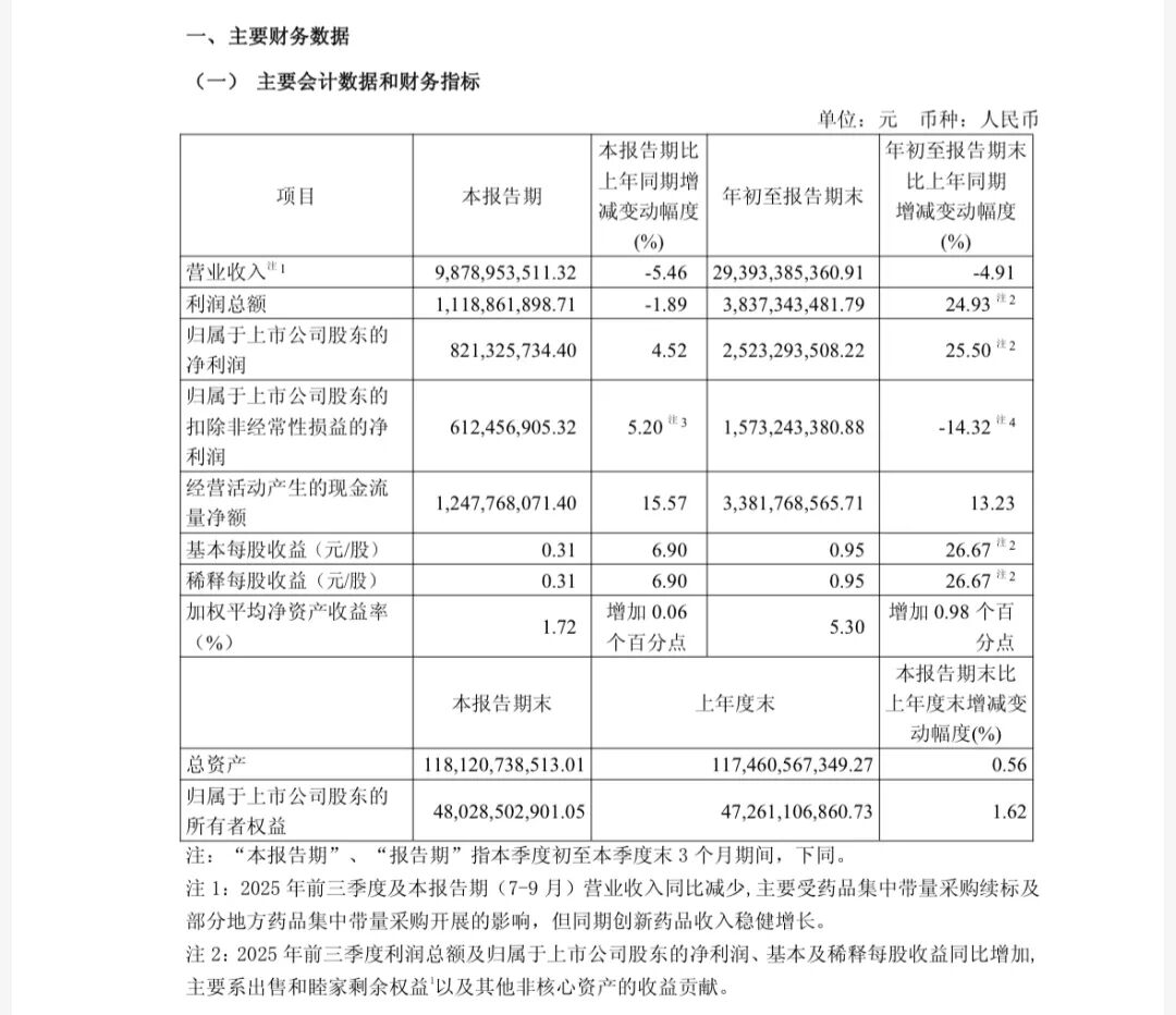 2025年三季度财务业绩 - 前三季度营业收入293.93亿元,同比下降4.91% [1] - 前三季度归母净利润25.23亿元,同比增长25.5% [1] - 第三季度营业收入98.79亿元,同比下降5.46% [4] - 第三季度净利润8.21亿元,同比增长4.52% [4] - 前三季度经营活动现金流净额33.82亿元 [1] - 第三季度经营活动现金流净额12.48亿元,同比增长15.57% [2] - 前三季度扣非净利润15.73亿元,同比下降14.32% [2] - 第三季度扣非净利润6.12亿元,同比增长5.2% [4] - 前三季度基本每股收益0.95元,同比增长26.67% [2] 创新药业务进展 - 前三季度创新药收入超67亿元,同比增长18.09% [1] - 地舒单抗注射液(HLX14)于2025年9月在美国和欧盟获批上市,成为首个在海外获批的国产地舒单抗 [3] - CAR-T产品布瑞基奥仑赛注射液(FKC889)的药品注册申请于2025年9月获国家药监局受理 [3] - 第三季度研发费用10.13亿元,同比增长28.81% [4] - 前三季度研发投入共计39.98亿元,同比增长2.12%,其中研发费用27.3亿元 [4] - 研发投入主要集中于核药、细胞治疗等创新平台及HLX22、HLX43等高价值管线的全球多中心临床研究 [4] 资产处置与资本运作 - 拟筹划转让上海克隆100%股权,交易对价不超过12.56亿元 [9] - 2025年进行多项资产处置,旨在优化资产结构、补充现金流并聚焦核心创新药业务 [9] - 拟参与子公司复星凯瑞的A轮融资,分期出资共计6亿元认缴新增注册资本,投前估值22亿元 [8] - 公司历史上曾多次分拆子公司上市融资,如复宏汉霖于2019年分拆在港股上市募资31.3亿港元 [8] 子公司分拆上市计划 - 宣布拟筹划分拆控股子公司复星安特金于香港联交所上市 [2] - 复星安特金专注于人用疫苗研发生产,截至2025年6月30日总资产39.72亿元,2025年1至6月营业收入1.53亿元,净利润-5845万元 [7] - 2024年曾筹划将医疗健康服务平台复星健康分拆上市,目前仍处于可行性论证阶段 [8] 债务状况 - 2025年中报显示短期借款178.62亿元,一年内到期的非流动负债47.84亿元,短期债务合计226.46亿元 [10] - 货币资金129.59亿元,短期偿债缺口达96.87亿元 [10] - 有息负债总额369.94亿元,其中长期借款110.95亿元 [10] 管理层变动与业务影响 - 2025年6月公司董事会和管理层进行大面积调整 [10] - 第三季度营业收入减少主要受药品集中带量采购续标及部分地方药品集中带量采购开展的影响 [4] - 前三季度利润总额及归母净利润增加主要系出售和睦家剩余权益及其他非核心资产的收益贡献 [4] - 扣非净利润同比下降受营业收入减少及复星凯瑞投入期亏损增加影响 [4]