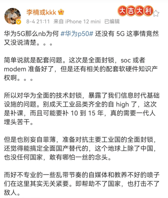 中国科技产业现状与挑战 - 中国科技产业在历史上存在核心技术依赖国外的问题,导致发展被动 [1] - 当前面临“卡脖子”技术难题,根源在于基础理论研究跟不上 [1] - 对特定公司的全面技术封锁,暴露了信息时代基础设施的问题,需要进行为期10到15年的“补课” [1][4] - 实现全面国产替代以对抗主要工业国全面封锁的挑战巨大,但中国是唯一有此潜力的国家 [4] 互联网企业的角色与投入 - 互联网企业在攻克“卡脖子”难题中扮演举足轻重的角色 [2] - 互联网企业已认识到基础研究的重要性,并大幅增加科研投入,例如2020年前两个季度,阿里巴巴研发投入达328亿元,腾讯投入179亿元 [1] - 这些企业拥有集中最优秀人才、最优质资源和最丰厚资金进行联合攻关的能力 [2] 企业研发合作与成果 - 解决技术难题不能单打独斗,必须加强合作 [1] - 以阿里巴巴达摩院为例,其采取“创新联合体”模式,联合高校建立研究所、研究室,并吸引国内外教授参与 [1] - 经过数年探索,达摩院已在人工智能、量子计算、芯片和自动驾驶等领域获得60多项世界领先成果 [1] - 该模式成功孵化了“平头哥”等芯片技术公司 [1] 具体技术瓶颈案例 - 以华为P50手机缺乏5G功能为例,问题根源在于配套的软硬件知识产权受到全面封锁,而不仅仅是主芯片或基带准备就绪 [4] - 此案例具体说明了在信息时代基础设施领域存在的短板 [4]