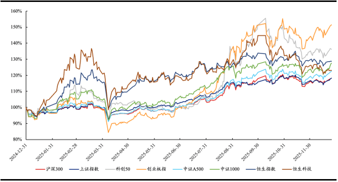 导读:在经历了2022到2023连续两年的低迷,以及2024年的924反转后,2025年是一个完整的 结构性牛市。截止2025年12月28日,沪深300为代表的宽基指数涨幅18.36%,为2020年以来最 大年度涨幅;创业板指为代表的新兴成长指数涨幅51.47%,同样为2020年以来最大年度涨幅。 在这一年,几乎每一个月都有重要的行业主题事件,市场保持了很强的活跃度。全年A股交易额 突破400万亿元,创下历史新高。 资料来源:Wind;数据截至2025年12月28日 我们简单罗列了2025年每一个月的重要主题事件: ● 1-2月以DeepSeek开源大模型驱动的AI大模型/算力成为开年核心,同时春晚人形机器人舞蹈 引发关注; ● 3月消费场景修复带动零售、餐饮板块补涨; ● 4月美国加征"对等关税"后,黄金、农业等避险板块及低估值蓝筹受资金青睐; ● 5月五一消费旺季推动消费、物流板块活跃; ● 6月阅兵预期升温叠加地缘冲突催化,军工板块走强,同时受政策落地影响,绿色建筑板块有 不错行情; ● 7月人形机器人规模化商用启动,AI算力需求持续爆发推动光模块、服务器标的走强,同时雅 下工程启动带动基建、建材相关板 ...
