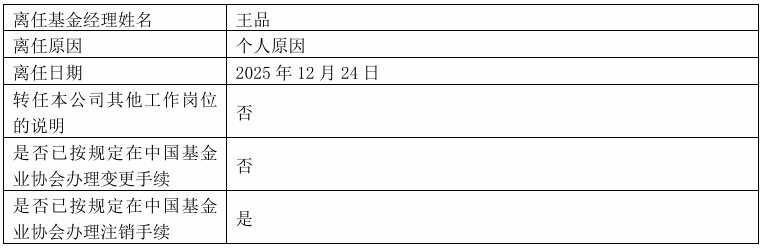 12月24日,兴证全球基金发布公告称,基金经理王品因个人原因离任兴全全球视野股票基金,并且不再转任 该公司其他工作岗位。 | 离任基金经理姓名 | 王品 | | --- | --- | | 离任原因 | 个人原因 | | 离任日期 | 2025年12月24日 | | 转任本公司其他工作岗位 | 否 | | 的说明 | | | 是否已按规定在中国基金 | 否 | | 业协会办理变更手续 | | | 是否已按规定在中国基金 | 是 | | 业协会办理注销手续 | | 这是王品年内第二次卸任基金产品,早在3月份,她就离任兴全合远两年持有混合基金。随着此次调整,王 品名下已无在管基金。 兴全全球视野股票基金成立于2006年9月,王品从2017年9月开始管理该基金,天天基金网数据显示,王品管 理该基金的任职回报为102.20%。 截至2025年12月24日,兴全合远两年持有混合A基金成立以来的单位净值下跌6.41%,近1年单位净值增长 28.35%,近3个月单位净值下跌11.35%。 截至三季度末,兴全合远两年持有混合基金持有股票占比为92.95%,持有债券占比为4.53%,前十大持仓个 股分别为斯菱股份、德昌电机控股 ...