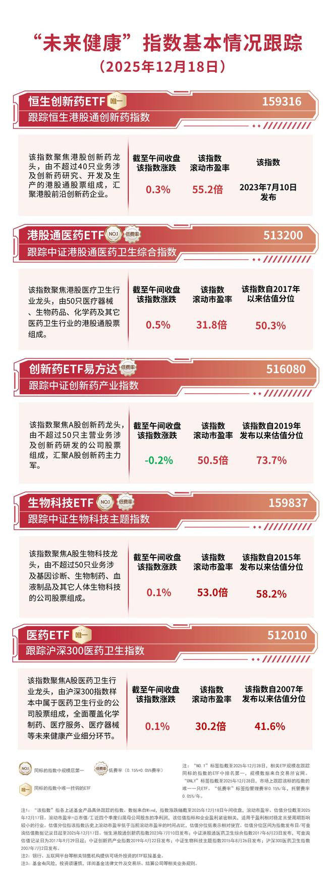 近日,云顶新耀宣布美国FDA已批准其心血管疾病领域产品乐瑞泊注射液用于降低高胆固醇血症患者低 密度脂蛋白胆固醇水平,公司计划2026年上半年在大中华区递交上市申请,该进展有望提振市场对创新 药国际化前景的信心。 截至午间收盘,中证港股通医药卫生综合指数上涨0.5%,恒生港股通创新药指数上涨0.3%,中证生物 科技主题指数、沪深300医药卫生指数均上涨0.1%,中证创新药产业指数下跌0.2%。 "ONLY" 标签指数至2025年12月28日,市场上跟踪该标的指数的 一只ETF。"低费率"标签指管理费率0.15%/年,托管费率 注 !: "该指数"指各上述基金产品具体跟踪的指数。数据来自Wind,指数涨跌幅截至2025年12月18日午间收盘,滚动市盈率、估值分位截至2025 年12月17日。滚动市盈率=总市值/江近四个拳度归属母公司股东的净利润,该信值指标和企业盈利紧密相关,适用于盈利相对稳定且受周期影响 较小的行业。结值分位指该指数历史上滚动市盈率低于当前滚动市盈邪的时间占比,估值分位低表示相对受宣。估值分位区间为指数发布日/可查 询估值数据记录日起至2026年12月17日,恒生港股通创新药指数2023年7月1 ...
