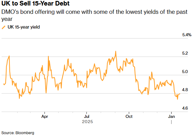 英国债务管理局债券发售 - 英国债务管理局正通过银行发售一笔票面利率为5.25%、2041年1月到期的15年期债券 [1] - 此次发售提供的收益率处于过去一年来的最低水平之列 [1] - 初步定价指引显示,其定价较可比英国国债高出约6.75至7个基点 [1] 历史发售与市场背景 - 去年10月对同类证券进行的类似发售吸引了超过发售额14倍的认购订单,最终筹集了90亿英镑(约合121亿美元) [1] - 目前英国15年期国债收益率徘徊在4.86%左右,较三个月前下降了约15个基点 [1] - 过去几个月政府官方借贷成本大幅下滑,原因是物价和经济增长出现降温迹象,货币市场押注英国央行将在第三年下调利率 [1] 市场预期与近期需求 - 掉期交易暗示,到12月将有近两次各25个基点的降息,届时基准利率将降至3.25%,为2022年以来最低水平 [1] - 本月通过拍卖发售的5年期和10年期英国国债需求依然强劲,两种债券的超额认购率均较上月有所上升 [5] 发售特点与安排 - 银团承销的成本通常高于拍卖,但它能让政府在实现投资者基础多元化的同时,快速筹集大规模资金 [5] - 英国债务管理局计划于下月发售一种新的中等期限绿色国债,这将是本财年最后一次通过银行进行的债务发售 [5] - 该笔新交易的联席簿记管理人包括美国银行、花旗集团、德意志银行、高盛集团和劳埃德银行集团 [5] 当前市场信息环境 - 投资者在参与此次债券竞标时将缺少一些重要的参考信息,英国通胀数据将于周三公布 [5] - 接受调查的经济学家预计,截至12月的一年期物价涨幅已升至3.3% [5] - 本周晚些时候还将陆续公布政府借款数据以及标普全球采购经理人指数(PMI) [5]