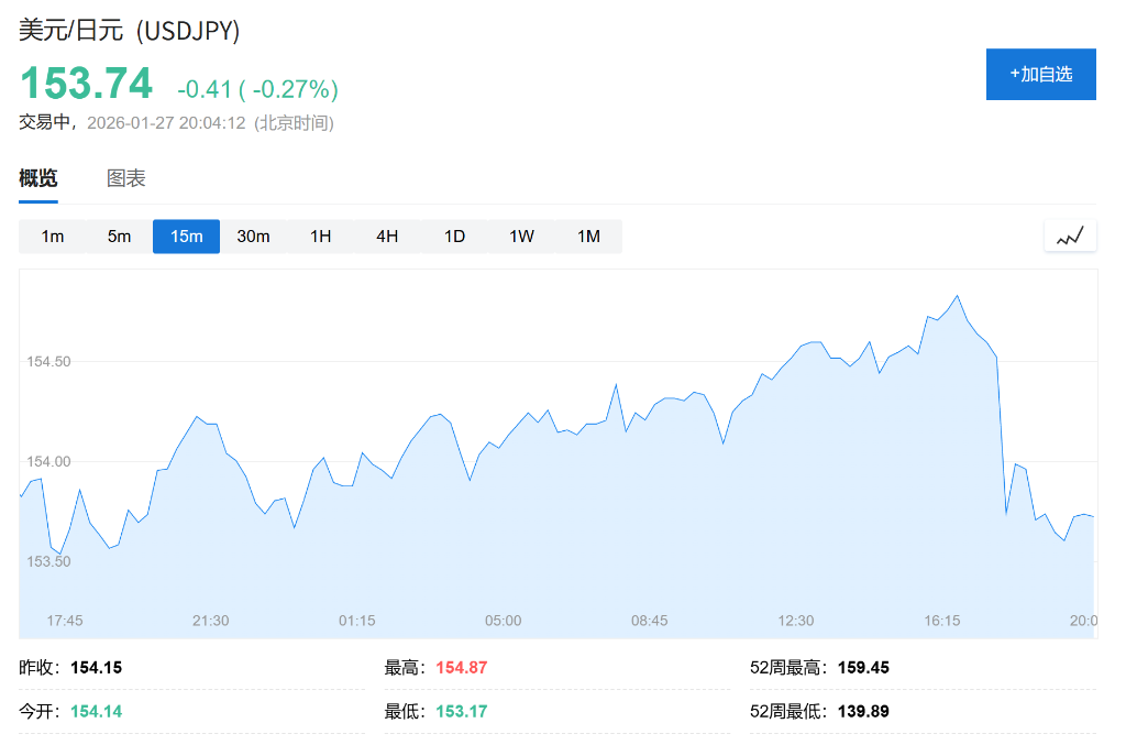 全球外汇市场迎来重磅信号。一场由美国央行参与、针对日元的"口头干预"行动,正迫使交易员重新评估美元/日元的前景,并为潜在的协同货币 干预做好准备。这标志着美国对外汇市场的态度可能发生重大转变。 行动的核心是上周五纽约联储代表美国财政部进行的"利率检查"。此举被市场广泛解读为美日官方可能协同入市支持日元的最强烈"口头"警告。 日本财务大臣片山皋月随后表态,政府正根据美日联合声明的精神应对汇率波动,进一步强化了两国协调行动的猜测。 此次事件迅速在外汇市场掀起波澜。美元/日元汇率从周五高点159.23急速下跌,周一早间一度跌破154关口,创下年内最大单日跌幅之一。期权 市场亦剧烈反应,短期波动率预期飙升,显示交易员正紧急为潜在的干预风险定价。 | 概览 | 图表 | | | | | | | | | | | | | --- | --- | --- | --- | --- | --- | --- | --- | --- | --- | --- | --- | --- | | 1m | 5m | 15m | 30m | 1H | 4H | 1D | 1W | 1M | | | | N | | 154.50 | | | | ...