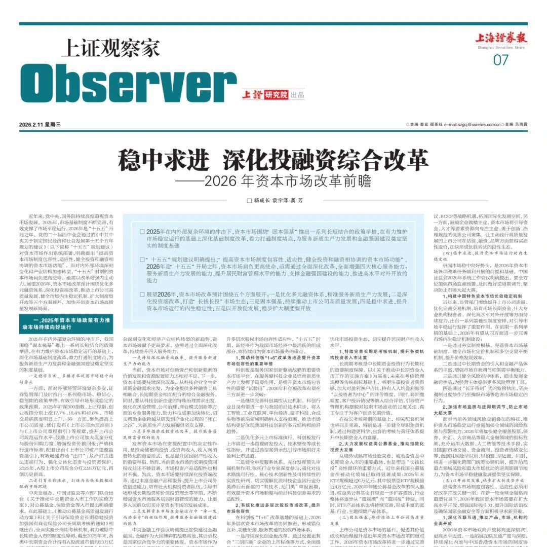 2025年资本市场政策回顾与市场表现 - 2025年政策围绕“固本强基”推出长短结合举措,有力维护了市场稳定运行并深化基础制度改革,为服务新质生产力发展和金融强国建设奠定制度基础 [6][8] - 在稳市场政策引导下,2025年主要股指显著上涨:沪深300指数上涨17.7%,上证综指上涨18.4%,创业板指上涨49.6%,市场交易活跃度明显上升 [9] - 聚焦提高上市公司质量,修订发布《上市公司治理准则》等规章,鼓励现金分红与股份回购,A股上市公司2025年现金分红达2.55万亿元,创历史新高 [9] - 推动中长期资金入市取得突破性进展,截至2025年末,各类中长期资金合计持有A股流通市值约23万亿元,较年初增长36%;权益类基金规模由年初8.4万亿元增至约11万亿元 [10] - 科创板改革深化落地,推出“1+6”改革举措,截至2025年底,科创板上市公司达600家,包括60家未盈利企业、9家特殊股权架构企业和7家红筹企业,其中22家未盈利企业已实现盈利“摘U” [11] - 2025年A股上市公司并购重组事件达2709件,同比增长约16%,其中重大资产重组事件84件,同比增长约105% [11] - 互联互通渠道活力增强,2025年北向资金累计成交额历史性突破50万亿元,年末持股市值达2.59万亿元,创历史次高水平 [12] 资本市场深化改革需提升的四大服务能力 - 需提升服务新质生产力发展的能力,从科技企业全生命周期金融需求出发,提供综合金融服务,助力科技成果转化 [13][14] - 需提升服务居民财富管理的能力,通过丰富金融产品和服务、提升上市公司价值创造能力、培育壮大机构投资者等措施,让人民群众分享发展成果 [15][16] - 需提升服务金融强国建设的能力,发挥资本市场在金融运行中的枢纽作用,统筹推进强大金融体系建设,增强我国金融体系的全球影响力 [17] - 需提升服务开放型经济的能力,以制度型开放为抓手,推动市场基础制度与国际标准衔接,增强全球资本配置中国资产的意愿 [18] 2026年资本市场改革五大方向前瞻 优化多元融资体系,精准服务新质生产力发展 - 推动科创板“1+6”改革落地,完善科创属性认定机制,将人工智能、量子科技等前沿领域纳入支持范围 [20][21] - 系统化推进多层次股权市场改革:深化创业板改革以服务“三创四新”企业;推动北交所、新三板一体化高质量发展以支持“专精特新”企业;健全多层次市场间的有机衔接制度 [22] - 发展多元化直接融资,健全多层次债券市场体系,重点推动科创债券、绿色债券等创新品种扩容,同时深化商业不动产REITs试点 [23] 深化投资端改革,打造“长钱长投”市场生态 - 持续完善长周期考核机制,在考核中更注重投资者获得感,加大对盈利客户占比、持有人人均盈利额等“以投资者为中心”的评价维度 [24][25] - 大力发展权益类公募基金,推动指数化投资大发展,2025年末ETF规模已超6万亿元,其中股票型ETF规模近4万亿元,2026年产品体系将持续完善 [26] 固本强基,持续推动上市公司高质量发展 - 多举措优化上市公司治理:外部强化监管保持“零容忍”高压态势;内部推动修订后的《上市公司治理准则》全面落地实施;鼓励保险资金等中长期资金作为积极股东参与公司治理 [27][28] - 推动上市公司市值管理效能提升,强化分红与股份回购的激励约束机制,提升主要指数成分股的分红收益率 [29] - 鼓励上市公司发挥主观能动性,引导要素资源向专注主业、勇于创新的优质公司聚集,支持其拓展国际化发展空间 [30] 稳中求进,提升资本市场运行的内生稳定性 - 构建中国特色资本市场长效稳定机制,从完善基础制度、引入中长期资金、健全风险对冲体系、强化“长牙带刺”式监管执法四方面着手 [31][32][33] - 加强市场监测与逆周期调节,运用大数据、人工智能等技术实时跟踪市场,强化跨部门统筹协调,防止市场大起大落 [34] 以开放促发展,稳步扩大制度型开放 - 深化互联互通,拓展沪深港通股票标的和“债券通”试点范围,加大ETF、REITs等产品开放力度,形成股票、债券、衍生品“三位一体”互联互通体系 [35][36] - 推动企业全球上市,深化跨境监管合作,引导企业完善治理与ESG建设,提升对境外投资者的吸引力 [36] - 在国际市场上讲好中国股市叙事,构建多层次国际传播体系,提升外资对中国资产的投资信心 [37]