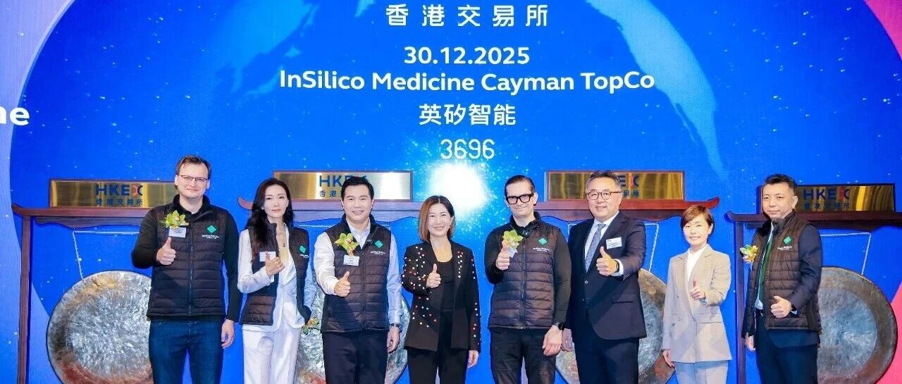 业务遍布全球的AI驱动生物科技公司。 据IPO早知道消息,InSilico Medicine Cayman TopCo(以下简称"英矽智能")于2025年12月30日正式以"3696"为股票代码在港交所主板挂牌上市。 这意味着,英矽智能成为首家通过联交所主板上市规则8.05条上市的人工智能生物医药科技公司。 值得一提的是,英矽智能本次IPO募集资金总额为22.77亿港元,是年内募集资金最高的港股生物医药IPO。同时,英矽智能本次香港发售获1427.37倍超额 认购,锁定认购资金逾3283.49亿港元,创下年内非18A港股医疗健康IPO香港公开发售认购金额之最;国际发售占比90%,录得26.27倍超额认购,创下年内 非18A港股医疗健康IPO国际配售认购倍数之最。 此外,英矽智能在本次IPO发行中还引入包括礼来公司、腾讯、淡马锡、施罗德、瑞银、橡树资本、易方达、泰康人寿等在内的15家全球化基石投资者,阵 容涵盖全球制药龙头、互联网巨头、国际主权基金与大型资管机构以及国内头部公募与险资。 截至11:00,英矽智能报于每股34.16港元,较发行价上涨42.04%,市值超190亿港元。 英矽智能创始人兼首席执行官、首 ...