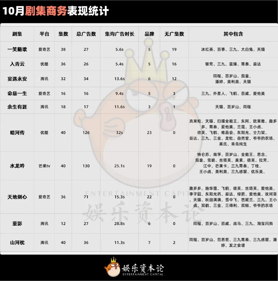 十月剧集市场整体表现 - 十月剧集市场古装剧和男频剧集集中上线但缺乏爆款,整体表现平淡,没有一部剧集能够明显脱颖而出[1] - 《入青云》在播出效果上表现相对突出,优酷平台热度突破一万,且完结后常在云合榜单中居榜一[1] - 多部重点剧集包括《水龙吟》、《暗河传》、《天地剑心》等收视率相差无几,竞争激烈但未形成明显差距[1] 重点古装剧集广告招商表现 - 《暗河传》是四部古偶作品中招商效果最为突出的剧集,总广告数达到126个,集均广告时长达32秒,是10月广告投放最为密集的剧集之一[2][3] - 《水龙吟》全集广告数量达到130个,集均广告时长为25秒,开局就有11个广告位,独家总冠名为特仑苏[5] - 《天地剑心》整体广告招商数据略逊色,全集共计71个广告投放,集均广告时长为15.3秒,开局仅4广,未有总冠名商[12] - 《山河枕》广告招商表现冷清,全集广告数仅36个,且包含两集无广剧情[19] 明星个人商业价值对剧集招商的影响 - 龚俊为《暗河传》带来极高广告投放热度,其代言的真果粒购买总冠名并投放全集广告,其他代言品牌如自然堂、欧莱雅等也加入广告投放[3][5] - 罗云熙官宣成为芒果TV会员合伙人后,芒果卡参与《水龙吟》广告投放,前十集投放中集均广告位高达8个,显示其强大抗剧能力[5] - 成毅在《天地剑心》的商务表现起到至关重要作用,其自带品牌合作占剧集广告投放三分之一以上,包括丝塔芙、玫珂菲、李子园等代言品牌[12][14][16][18][19] 现代剧集广告招商表现 - 现代剧集在广告招商上表现相对低迷,整体招商情况较为惨淡[19] - 《命悬一生》品牌投放数量仅为16个,集均广告时长为9.4秒,反映悬疑题材在招商上的先天瓶颈[19] - 《余生有涯》品牌投放数量为9个,集均广告时长为11.6秒,市场吸引力相对有限[20] - 《重影》集均广告时长高达28.8秒,但品牌投放数量仅为个位数,广告商市场认可度较低[20] 行业品牌投放策略分析 - 医药健康类成为剧集投放最大赢家,"三九"系列(三九胃泰、三九感冒)覆盖7部剧集,东阳光、双鹤等药企同样活跃[22][23] - 食品饮料类品牌中"百岁山"在5部剧集中频繁亮相,"天猫"和"王小卤"分别覆盖4部剧集,银鹭、冰红茶、百事、特仑苏等品牌也多次出现[23] - 外卖平台广告投放力度放缓,淘宝闪购仅在《重影》一部现代剧作品中出现,投放力度显著减少,反映行业竞争进入相对疲软阶段[25]