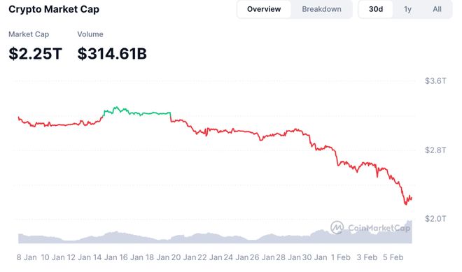 加密市场近期表现 - 近30日加密市场总市值持续下行,当前约为2.25万亿美元 [1] - 自2026年1月14日以来,市场在过去22天内平均每日下跌约450亿美元 [1] - 自2026年1月14日以来,加密市场总市值蒸发已超过1万亿美元 [1]