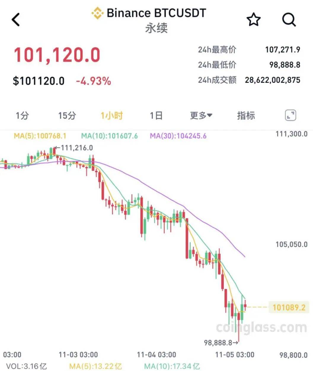 近日,加密货币市场集体大跌。 11月5日凌晨,比特币价格失守10万美元关口,为6月以来首次。 以太坊跌破3100美元/枚,一度跌超14%。 此外,BNB、索拉纳币、STETH等均跌超5%。 | 排名 币种 | | | 最新价格 | 24H涨幅 | 24H最高 | 24H最低 | 24H成交额 | 历史高/低 | 流通市值 | 总/流通数量 | 7天走势图 | | --- | --- | --- | --- | --- | --- | --- | --- | --- | --- | --- | --- | | 1 | BTC B 比特币 | | $101095 ¥720332 | -5.03% | $107189 ¥763754 | $99076 ¥705946 | $1116.26亿 ¥7953.67亿 | $126080 $67.81 | $2.02万亿 ¥143663.43亿 | 1994.41万 1994.41万 | 3 | | | ETH | | $3273.55 | | $3649.01 | $3097.71 | $700.97亿 | $4946.05 | $3951.10亿 | 1.21亿 | | ...