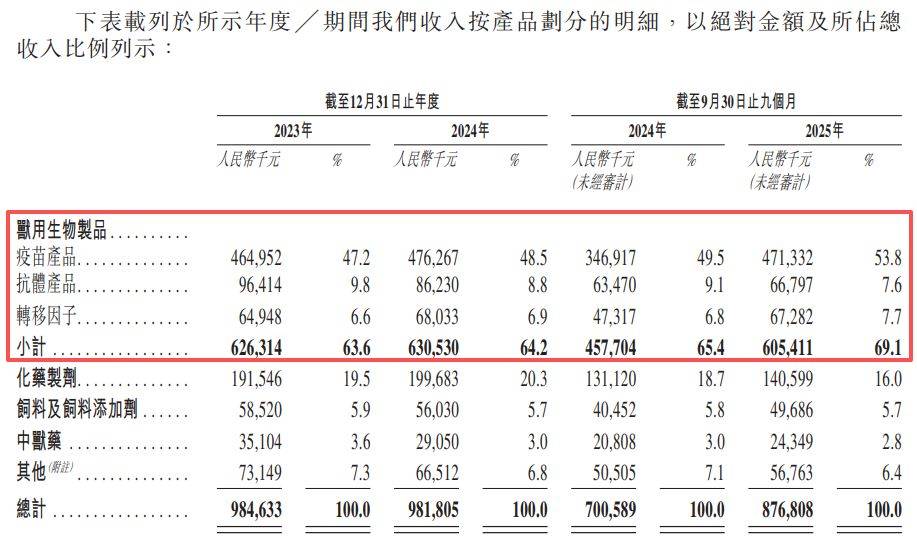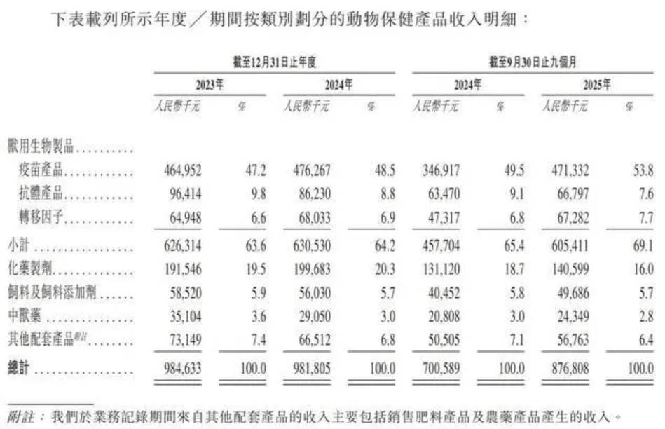 公司概况与市场地位 - 公司是中国领先的动物保健企业,以2024年收入计,在中国动物保健市场以1.4%的份额排名第九,在中国禽用兽用生物制品市场以7.9%的份额排名前三 [1] - 公司成立于1999年,主要从事全系列动物保健及配套产品的研发、生产及销售,旗下有20家子公司 [1] - 截至2025年9月30日,公司获得近300个兽药产品生产文号,为防控禽流感病毒、新城疫病毒等核心禽畜疫病提供保障 [2] 财务业绩表现 - 2024年全年收入为98.18亿元人民币,较2023年微降0.3%;2025年前九个月收入为87.68亿元人民币,同比增长25.2% [1][3] - 2024年全年净利率为2.8%,2025年前九个月净利率提升至6.3% [1] - 2023年、2024年及2025年前九个月的毛利率分别为46.3%、46.0%及49.7% [5] - 2025年前九个月经营现金流净额为1.19亿元人民币 [8] - 截至2025年9月,公司拥有现金及现金等价物1.37亿元人民币 [1] 业务结构与产品收入 - 公司产品涵盖兽用生物制品、中兽药、化药制剂、动物饲料及饲料添加剂 [2] - 疫苗产品是收入核心,2024年及2025年前九个月收入份额分别为48.5%和53.8% [2][3] - 兽用生物制品(含疫苗、抗体、转移因子)合计收入份额最高,2025年前九个月达69.1% [3] - 化药制剂是第二大收入来源,2024年及2025年前九个月收入份额分别为20.3%和16.0% [2][3] 增长战略与市场拓展 - 公司通过三大业务分部战略驱动增长:成熟业务(禽用保健产品,收入贡献近八成)、成长业务(国内基本盘及国际业务)、培育业务(宠物及水产动物保健) [4] - 海外业务是核心增长点,已进入巴基斯坦、埃及及越南市场,并正在31个国家筛选分销合作伙伴及启动注册程序 [4] - 2025年前九个月,国际业务增速超过100% [4] - 销售以直销为主,2025年前九个月直销收入占比高达67.9%,主要客户包括大型动物养殖场及政府机构 [4] - 客户集中度较低,过往业绩前五大客户收入贡献不到20% [4] 研发与竞争优势 - 公司持续投入研发,2023年、2024年及2025年前九个月的研发费用率分别为7.0%、8.2%及7.5% [6] - 研发团队由189名员工组成,其中超过60%持有生物制品、基因工程等领域的博士或硕士学位 [6] - 截至最后实际可行日期,公司积累82项发明专利 [7] - 公司拥有多项行业领先技术:其兽用转移因子产品(信必妥)是中国国内首个获批的转移因子产品,并在该细分市场位居首位;是全球首家采用悬浮培养技术生产高致病性禽流感疫苗的企业;是中国首家获批生产可预防四种病毒的四联疫苗的企业 [7] 生产制造与产能 - 公司已投入11亿元人民币建设先进的制造产能 [7] - 在山东、北京等地建立了四大生产基地,拥有34条全部通过新版兽药GMP认证的生产线 [7] - 具备提供动物疾病控制综合解决方案的生产能力,涵盖预防及治疗产品 [7] 行业背景 - 2024年全球动物保健行业市场规模为511亿美元(约合3525.9亿元人民币),近五年复合年增长率为4.9% [1] - 2024年中国动物保健市场规模为680亿元人民币,近五年复合年增长率为6% [1] - 中国有超过1500家兽药生产商,行业竞争激烈 [6] - 行业具备明显的技术研发壁垒,核心技术如基因工程疫苗、新型佐剂等被行业巨头垄断 [6]