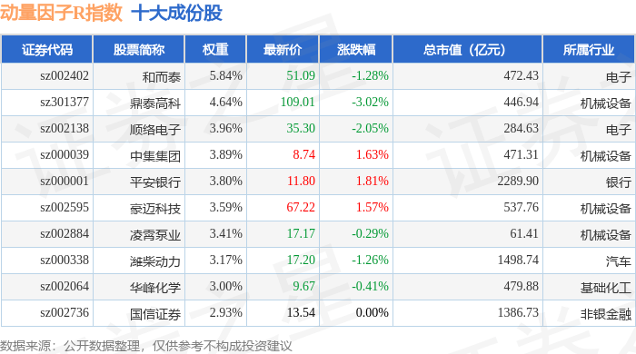 资金流向方面,动量因子R(480057)指数成份股当日主力资金净流出合计9.49亿元,游资资金净流出合 计1.26亿元,散户资金净流入合计10.75亿元。成份股资金流向详情见下表: 证券之星消息,11月19日,动量因子R(480057)指数报收于2822.78点,跌0.48%,成交279.37亿元,换 手率1.23%。当日该指数成份股中,上涨的有17家,大中矿业以4.77%的涨幅领涨,下跌的有31家,瑞达 期货以9.99%的跌幅领跌。 动量因子R(480057)指数十大成份股详情如下: | 代码 | 名称 | 主力净流入(元) | 主力净占比 游资净流入(元) | | 游资净占比 散户净流入(元) | | 散户净占比 | | --- | --- | --- | --- | --- | --- | --- | --- | | 000333 美的集团 | | 2.11 乙 | 12.68% | -1.91亿 | -11.50% | -1962.80万 | -1.18% | | 000001 | 平安银行 | 1.87亿 | 11.95% | -1.28亿 | -8.17% | -5916.97万 | -3.78% ...