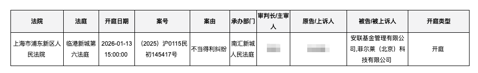 安联基金澄清与涉案方无合作 原告张某以"不当得利纠纷"为由起诉安联基金,同时被起诉的还有菲尔莱(北京)科技有限公司(以下简称菲尔莱),案件暂定于1月13 日在上海开庭。 | 上海市浦东新区人 民法院 | 临港新城第 2026-01-13 六法庭 | 15:00:00 | (2025) 沪0115民 初145417号 | 不当得利纠纷 | 南汇新城 人民法庭 | | | 安联基金管理有限公 司,菲尔莱(北京)科 技有限公司 | 开庭 | | --- | --- | --- | --- | --- | --- | --- | --- | --- | --- | | 法院 | 法庭 | 开庭日期 | 案号 | 案由 | 承办部门 | 审判长/主审 | 原告/上诉人 | 被告/被上诉人 | 开庭类型 | 21世纪经济报道记者杨娜娜 上海报道 2026新年首月,安联基金、国投瑞银、华宝基金和联博基金等多家公募基金,被推向法院被告席。 上海市高级人民法院公告显示,针对这几家机构的起诉案由横跨金融委托理财合同纠纷、不当得利及劳动争议等多种类型。其中,不仅涉 及明星基金经理,还有外资新锐公募被牵连。 安联基金是由安联投资全资 ...