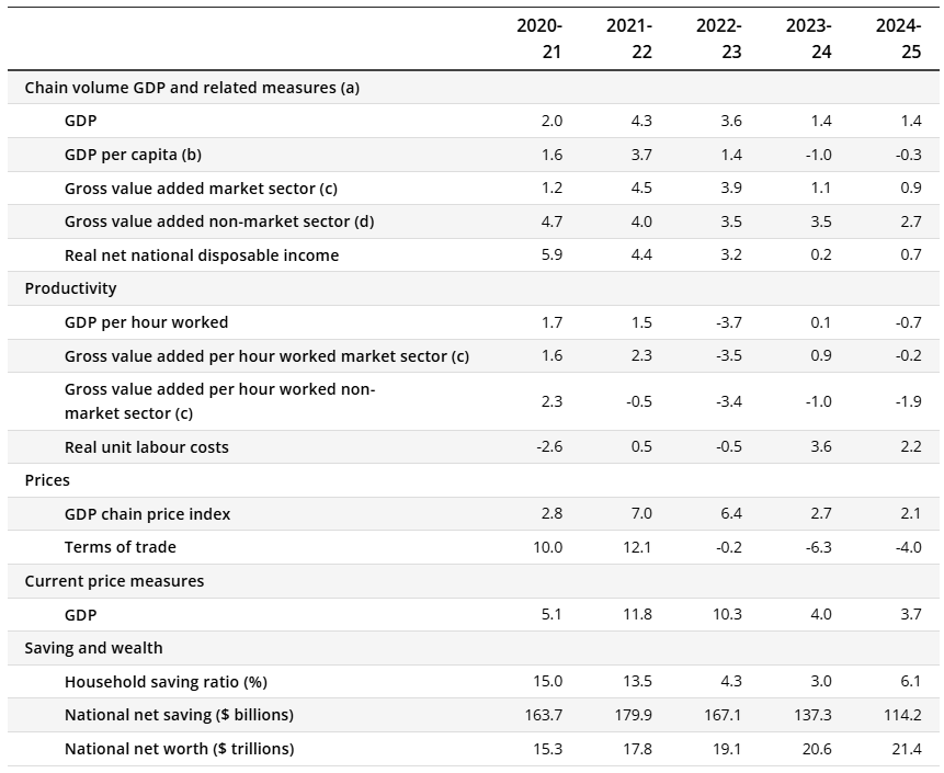 从劳动生产率来看,2024-2025财年澳大利亚每工作小时GDP减少0.7%,而前一财年则增长0.1%;实际单位劳动力成本增 长2.2%,涨幅低于前一财年的3.6%。 新华财经悉尼10月24日电(记者李晓渝)澳大利亚统计局24日发布的报告显示,预计2024-2025财年澳大利亚GDP增长 1.4%,增幅与前一财年持平,但低于2022-2023财年的3.6%,以及2021-2022财年的4.3%。 按现价计算,澳大利亚GDP增幅在2024-2025财年将达到3.7%,低于2023-2024财年的4%,也低于2022-2023财年的10.3%。 报告显示,澳大利亚的人均GDP继续下滑0.3%,延续了2023-2024财年下滑1%的走势,但跌幅有所减小。 (文章来源:新华财经) 此外,该国家庭储蓄率从前一财年的3%上升至6.1%。国家净储蓄达到约1142亿澳元(约合人民币5297.28亿元),低于 2023-2024财年的1373亿澳元;国家净财富达到约21.4万亿澳元,高于前一财年的20.6万亿澳元。 | | 2020- | 2021- | 2022- | 2023- | 2024- | | --- | --- ...