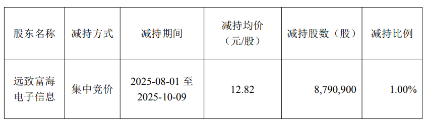 控股股东减持完成 - 控股股东远致富海电子信息减持计划已实施完成 减持期间为2025年8月1日至10月9日 [1] - 通过集中竞价方式减持8,790,900股 减持均价为12.82元/股 减持比例为1.00% [1][2] - 本次减持总金额约为1.13亿元 [1] 公司资本运作与并购 - 公司完成发行股份及支付现金购买资产 收购安可远100%股权及金之川20%的少数股权 [2] - 交易完成后 安可远成为公司全资子公司 对金之川的持股比例从67.50%提升至87.50% [2] - 公司同时募集配套资金 总额不超过10,140.00万元 发行股份数量不超过交易后总股本的30.00% [3] 历史融资情况 - 公司于2021年7月进行向特定对象发行股票 发行数量为157,647,058股 发行价格为8.50元/股 [3] - 该次发行募集资金总额为1,339,999,993.00元 扣除发行费用后募集资金净额为1,330,087,518.09元 [3]