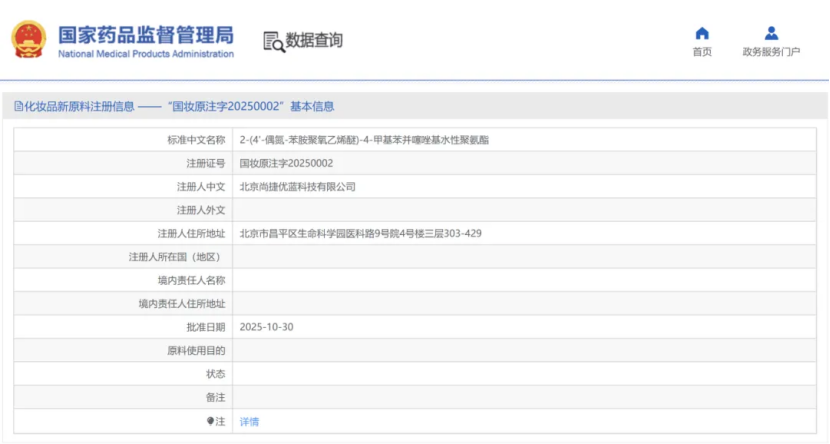 近日,在国家药监局鼓励创新的政策支持下,中检院依法依规指导,我国化妆品原料领域迎来重大突破 ——北京尚捷优蓝科技有限公司自主研发的"2-(4'-偶氮-苯胺聚氧乙烯醚)-4-甲基苯并噻唑基水性聚氨 酯"(商品名:安色®洛神朱)正式通过国家药品监督管理局(NMPA)审批,成为全球首个获批用于化妆品 领域的高分子着色剂。这是自2021年《化妆品新原料注册备案资料管理规定》实施以来,第二个成功获 批的注册类新原料,也是第一个成功获批的注册类国产化妆品新原料,标志着我国在化妆品着色技术领 域实现从"跟跑"到"领跑"的历史性跨越。 | | | B | 8 | | --- | --- | --- | --- | | National Medical Products Administration | | 首页 | 政务服务门户 | | 目化妆品新原料注册信息 -- "国妆原注字20250002" 基本信息 | | | | | 标准中文名称 | 2-(4'-偶露-苯胺聚氧乙烯酰)-4-甲基苯并哪唑基水性聚氨酯 | | | | 注册证号 | 国妆原注字20250002 | | | | 注册人中文 | 北京尚捷优蓝科技有限公司 ...