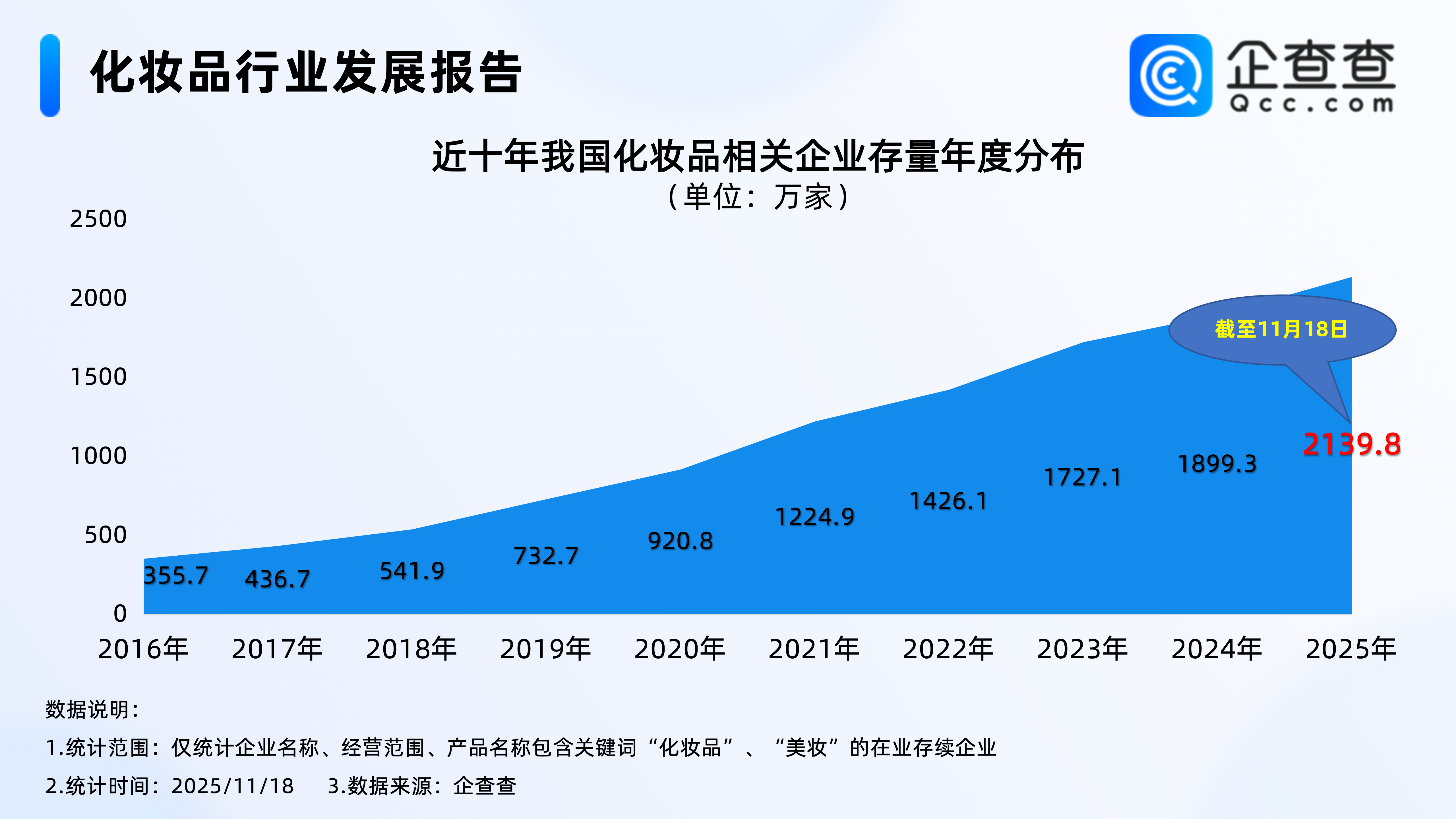 政策发布与市场反应 - 国家药监局发布《关于深化化妆品监管改革促进产业高质量发展的意见》,围绕五个方面提出24项改革措施,旨在鼓励创新、优化管理、强化风险防控、提升智慧监管及推动国际接轨,以培育新质生产力并助推行业高质量发展 [1] - 受政策利好影响,11月18日化妆品概念股表现活跃,丽人丽妆涨停,敷尔佳、拉芳家化、芭薇股份、水羊股份等跟涨 [1] - 情绪消费成为当前化妆品消费的重要驱动力 [1] 行业企业存量与分布 - 截至11月18日,中国现存化妆品相关企业总量为2139.8万家 [1] - 从区域分布看,华东地区企业数量最多,占比超过30% [1] - 华南地区和华中地区分别为第二和第三大集中区域,占比分别为20.4%和17.3% [6] - 西北地区和东北地区占比较小,分别为8.3%和5.4% [6] 年度新注册企业情况 - 2025年以来(截至11月18日),中国新注册化妆品相关企业数量为424.9万家 [8] - 新注册企业在区域分布上出现变化,华中地区占比最高,达到27%,超越了华东地区和华南地区 [8]