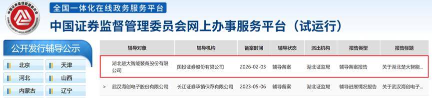 上市辅导与历史沿革 - 湖北楚大智能装备股份有限公司已向湖北证监局提交向北交所公开发行股票的辅导备案申请,备案时间为2026年2月3日,辅导机构为国投证券 [1] - 辅导协议签署于2026年1月27日,参与辅导的证券服务机构包括北京市君合律师事务所及中审众环会计师事务所 [2] - 公司曾于2024年6月向北交所提交上市申请,后于2025年8月1日主动撤回,北交所在2025年8月14日决定终止审核 [3] 公司业务与行业 - 公司成立于2005年,主营业务是为玻璃包装容器和玻璃制品生产企业提供玻璃成型设备、粉体物自动配料系统、基于机器人的产线智能化单元等关键设备和智能化产线 [3] - 同行业可比公司包括永创智能、达意隆、新美星、中亚股份 [3] - 公司直接服务于各类玻璃生产企业,客户包括贵州茅台酒厂(集团)贵定晶琪玻璃制品有限公司、四川省宜宾环球格拉斯玻璃制造有限公司、山东省药用玻璃股份有限公司、广东华兴玻璃股份有限公司、江苏天玻包装有限公司、PGP Glass Private Limited等 [3] 财务表现 - **营业收入**:2023年度为30,008.22万元,2024年度为31,241.11万元,同比增长4.1%;2025年1-9月为23,921.51万元 [3][4] - **归母净利润**:2023年度为4,455.58万元,2024年度为5,440.91万元,同比增长22.1%;2025年1-9月为3,578.95万元 [3][4] - **毛利率**:2023年度为32.64%,2024年度为34.36%,提升1.72个百分点;2025年1-9月为33.84% [4] - **每股收益**:2023年度为1.44元/股,2024年度为1.76元/股;2025年1-9月为1.16元/股 [4] - **加权平均净资产收益率(归母净利润)**:2023年度为46.57%,2024年度为38.69%,2025年1-9月为19.13% [4] - **经营活动现金流**:2023年度为7,908.76万元,2024年度为4,594.46万元,2025年1-9月为6,321.53万元 [4] - **应收账款周转率**:2023年度为8.15次,2024年度为7.28次,2025年1-9月为5.27次 [4] - **存货周转率**:2023年度为2.21次,2024年度为1.71次,2025年1-9月为1.33次 [4] 资产负债与运营指标 - **应收账款**:2023年末为3419.10万元,2024年末为4466.27万元,增长30.6%;2025年9月末为6686.33万元,较2024年末增长49.7% [5] - **存货**:2023年末为10268.45万元,2024年末为13286.31万元,增长29.4%;2025年9月末为17965.34万元,较2024年末增长35.2% [5] - **负债总计**:2023年末为22415.14万元,2024年末为27445.66万元,增长22.5%;2025年9月末为39495.47万元,较2024年末增长43.9% [5] 本次发行与募投项目 - 本次发行拟募集资金总额为2.05亿元 [5] - **智能装备生产基地建设项目**:投资总额16,826.90万元,拟投入募集资金13,619.89万元 [6] - **智能装备研发中心建设项目**:投资总额6,913.90万元,拟投入募集资金6,913.90万元 [6] - 两个募投项目合计投资总额为23,740.80万元 [6] 公司股权与控制权 - 董事长邓家辉合计能够控制公司64.9946%的股份,为公司控股股东及实际控制人 [6]
