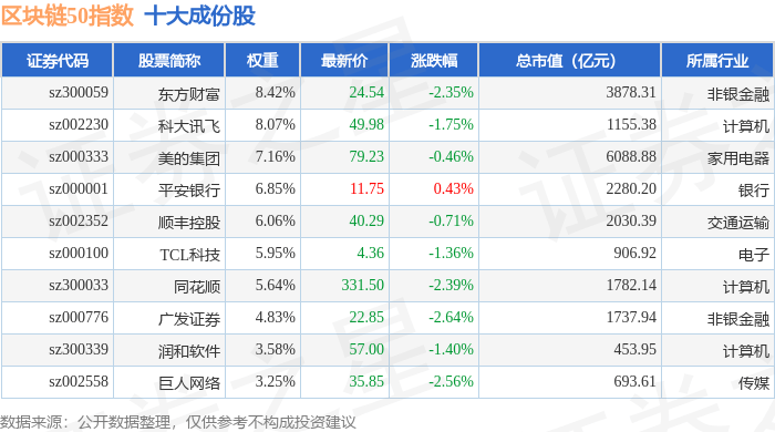区块链50指数市场表现 - 11月14日区块链50指数报收3982.08点,单日下跌1.49% [1] - 指数成份股总成交额为351.97亿元,换手率为1.74% [1] - 指数成份股中仅4家上涨,45家下跌,易华录以3.15%涨幅领涨,汉得信息以3.57%跌幅领跌 [1] 十大权重成份股详情 - 东方财富为第一大权重股,权重8.42%,股价下跌2.35%,总市值3878.31亿元 [1] - 科大讯飞权重8.07%,股价下跌1.75%,总市值1155.38亿元 [1] - 美的集团权重7.16%,股价微跌0.46%,总市值6088.88亿元 [1] - 平安银行权重6.85%,股价逆势上涨0.43%,总市值2280.20亿元 [1] - 顺丰控股权重6.06%,股价下跌0.71%,总市值2030.39亿元 [1] - TCL科技权重5.95%,股价下跌1.36%,总市值906.92亿元 [1] - 同花顺权重5.64%,股价下跌2.39%,总市值1782.14亿元 [1] - 广发证券权重4.83%,股价下跌2.64%,总市值1737.94亿元 [1] - 润和软件权重3.58%,股价下跌1.40%,总市值453.95亿元 [1] - 巨人网络权重3.25%,股价下跌2.56%,总市值693.61亿元 [1] 指数成份股资金流向 - 指数成份股整体主力资金净流出29.88亿元 [3] - 游资资金整体净流入7.2亿元,散户资金整体净流入22.68亿元 [3] - 平安银行获主力资金净流入1.28亿元,主力净占比8.26%,为净流入额最高个股 [3] - 易华录获主力资金净流入4129.07万元,主力净占比10.48% [3] - 中文在线获主力资金净流入3155.75万元,主力净占比2.99% [3]