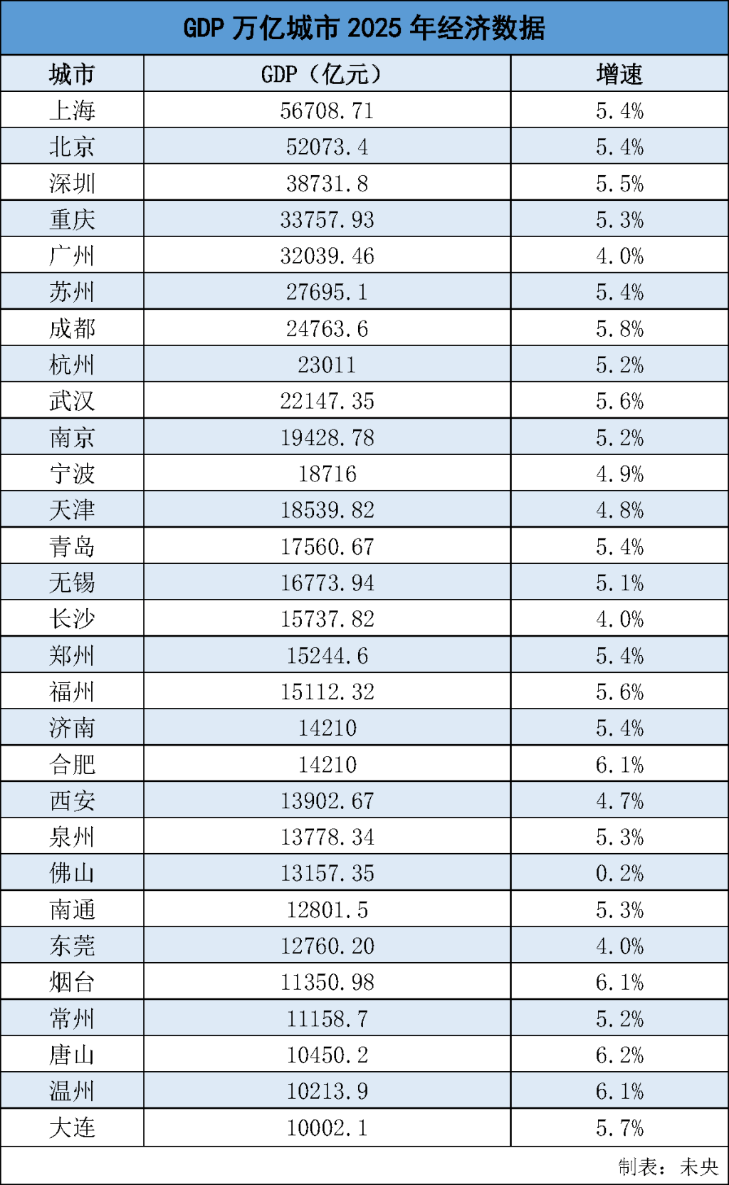 中国万亿GDP城市2025年经济表现综述 - 中国大陆29座万亿GDP城市2025年经济数据全部公布 22座城市的经济增速快于全国5.0%的平均水平 其中唐山以6.2%的增速领跑 在外部环境变化影响加深、供强需弱矛盾突出的背景下 上海等十座城市的增速较2024年加快 彰显区域经济韧性与活力 [1] - 2025年 温州GDP突破万亿 大连实现东北地区万亿城市零的突破 全国万亿城市总数扩容至29座 包括4大直辖市、11个省会城市、4个计划单列市及10个普通地级市 这些城市GDP合计占全国比重增至42.5% [1] 万亿城市经济总量分层结构 - 从体量看 万亿城市呈现“2+3+4+N”的分层结构 上海、北京两市GDP分别高达5.67万亿元和5.21万亿元 深圳、重庆、广州处于3万亿至4万亿元区间 苏州、成都、杭州、武汉则超过2万亿元 [1] - 长三角城市群经济集聚效应显著 区域内10座万亿城市2025年GDP合计21.07万亿元 约占全国总量的15.0% [5] 主要城市GDP与增速数据 - 上海GDP为56708.71亿元 增速5.4% 北京GDP为52073.4亿元 增速5.4% 深圳GDP为38731.8亿元 增速5.5% 重庆GDP为33757.93亿元 增速5.3% 广州GDP为32039.46亿元 增速4.0% [3] - 苏州GDP为27695.1亿元 增速5.4% 成都GDP为24763.6亿元 增速5.8% 杭州GDP为23011亿元 增速5.2% 武汉GDP为22147.35亿元 增速5.6% [3] - 南京GDP为19428.78亿元 增速5.2% 宁波GDP为18716亿元 增速4.9% 天津GDP为18539.82亿元 增速4.8% 青岛GDP为17560.67亿元 增速5.4% 无锡GDP为16773.94亿元 增速5.1% [3] - 长沙GDP为15737.82亿元 增速4.0% 郑州GDP为15244.6亿元 增速5.4% 福州GDP为15112.32亿元 增速5.6% [3] 中游城市竞争格局与位次变化 - 济南与合肥GDP均为14210亿元 实现总量追平 而2020年济南曾领先合肥135亿元 最近五年合肥年均增速达到6.1% [2] - 佛山2024年排全国城市第二十位 2025年增速仅为0.2% 被西安(13902.67亿元)、泉州(13778.34亿元)两市超越 [2][3][4] - 常州与烟台同为2023年加入“万亿俱乐部” 当年常州领先31亿元 2024年保持27亿优势 但2025年被烟台反超 烟台GDP达11350.98亿元(增速6.1%) 常州GDP为11158.7亿元(增速5.2%) 两者差距逆转为190多亿元 [2][4] 高增长与增速回升城市表现 - 唐山以6.2%的增速领跑所有万亿城市 合肥、烟台、温州增速均为6.1% 其中合肥与烟台已连续两年增长6.1% [4] - 十座城市增速较2024年加快 其中南京回升幅度达0.7个百分点 唐山加快0.6个百分点 杭州、大连均加快0.5个百分点 [4] - 上海以超5万亿元的经济体量实现5.4%的增长 增速较上年提升0.4个百分点 [4] 其他万亿及准万亿城市数据 - 西安GDP为13902.67亿元 增速4.7% 泉州GDP为13778.34亿元 增速5.3% 佛山GDP为13157.35亿元 增速0.2% 南通GDP为12801.5亿元 增速5.3% 东莞GDP为12760.20亿元 增速4.0% [3][4] - 烟台GDP为11350.98亿元 增速6.1% 常州GDP为11158.7亿元 增速5.2% 唐山GDP为10450.2亿元 增速6.2% 温州GDP为10213.9亿元 增速6.1% 大连GDP为10002.1亿元 增速5.7% [4] - 徐州(9957亿元)、沈阳(9100亿元)GDP已超过9000亿元 厦门、绍兴、石家庄、昆明、潍坊、南昌、扬州、盐城、长春GDP超过8000亿元 被视为“准万亿城市” [5] 万亿城市区域分布 - 除直辖市外 25座万亿城市分布于13个省 江苏拥有5座 广东4座 山东与浙江各3座 福建2座 四川、河南、湖北、湖南、安徽、河北、陕西、辽宁各1座 [5] - 以城市群计 京津冀城市群有3座万亿城市 粤港澳大湾区有4座 长三角有10座 [5]