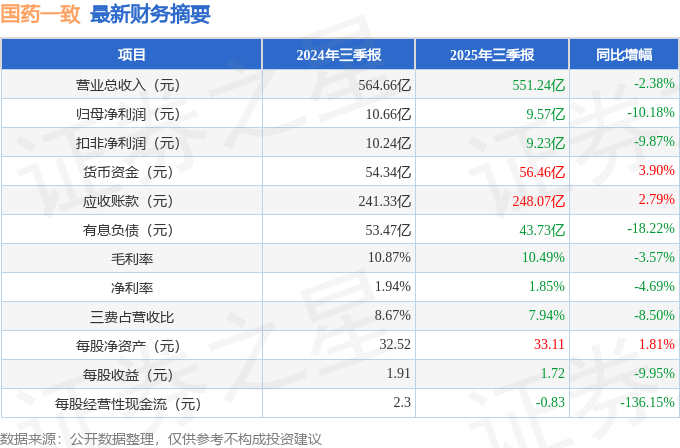 据证券之星公开数据整理,近期国药一致(000028)发布2025年三季报。根据财报显示,国药一致净利 润同比下降10.18%。截至本报告期末,公司营业总收入551.24亿元,同比下降2.38%,归母净利润9.57 亿元,同比下降10.18%。按单季度数据看,第三季度营业总收入183.28亿元,同比下降1.89%,第三季 度归母净利润2.91亿元,同比下降9.58%。 本次财报公布的各项数据指标表现不尽如人意。其中,毛利率10.49%,同比减3.57%,净利率1.85%, 同比减4.69%,销售费用、管理费用、财务费用总计43.75亿元,三费占营收比7.94%,同比减8.5%,每 股净资产33.11元,同比增1.81%,每股经营性现金流-0.83元,同比减136.15%,每股收益1.72元,同比 减9.95% | 项目 | 2024年三季报 | 2025年三季报 | 同比增幅 | | --- | --- | --- | --- | | 营业总收入(元) | 564.66亿 | 551.24 Z | -2.38% | | 归母净利润(元) | 10.66 Z | 9.57亿 | -10.18% | | 扣非净利润 ...