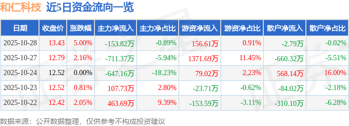 和仁科技(300550)10月28日主力资金净卖出153.82万元