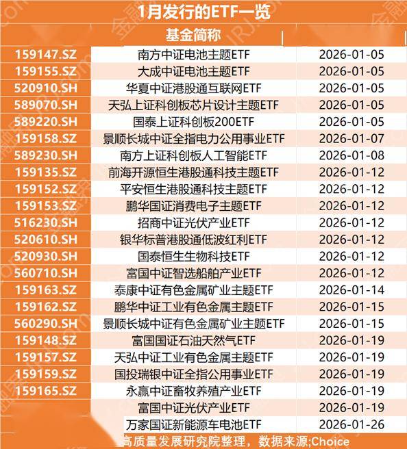 市场行情与基金发行热潮 - A股开年走出“十七连阳”强劲行情,直接催生公募基金发行热潮 [1] - 以认购起始日计算,1月5日至1月11日当周,全市场共有45只新基金进入募集期,创近十二周以来新高,环比增幅超400% [1] - 1月12日至1月18日当周,仍有36只基金启动认购 [1] - 综合已披露公告,仅1月确定发行的新基金(主份额)多达117只,较去年同期大幅增加35只 [1] 新发基金布局方向 - 科技与医药是公募基金年初抢滩布局的核心赛道 [1] - 指数产品方面,1月确认启动认购的ETF已达23只(仅统计主份额) [1] - 新发ETF多聚焦互联网、科创芯片、消费电子、人工智能等科技主题,同时覆盖生物科技、有色金属、光伏、新能源等多个板块 [1] - 主动权益基金的发行更偏向科技、成长、景气等投资风格,1月新发该类基金中名称带有相关关键词的产品占比至少过半,医药类基金也占据不小份额 [2] 新发ETF产品详情 - 1月发行的ETF产品覆盖电池主题、港股通互联网、科创板芯片设计、科创板200、人工智能、消费电子、光伏产业、生物科技、船舶产业、有色金属、石油天然气、公用事业、畜牧养殖、新能源车电池等多个细分领域 [2] - 具体产品包括南方中证电池主题ETF、大成中证电池主题ETF、华夏中证港股通互联网ETF、天弘上证科创板芯片设计主题ETF、国泰上证科创板200ETF、景顺长城中证全指电力公用事业ETF、南方上证科创板人工智能ETF等 [2] 新发主动权益基金详情 - 1月发行的主动权益基金包括偏股混合型、普通股票型、QDII、灵活配置型等多种类型 [5] - 具体产品涉及科技、医药、消费、价值、成长、半导体、港股通、低碳经济等多个主题 [5] - 代表性产品包括平安港股医疗优选股票(QDII)A、汇添富科技领先混合A、大摩沪港深科技混合A、上银科技创新股票发起式A、泓德医药精选混合发起式A、易方达港股通医药混合A、中银先锋半导体混合发起A等 [5] 重点医药基金发行情况 - 平安基金旗下平安港股医疗优选基金于2026年1月5日启动发行,预计1月27日完成募集,由医药明星基金经理周思聪掌舵 [3] - 招商基金旗下招商医药量化选股基金、泓德基金旗下泓德医药精选基金近期也相继开启发售,均预计于2026年1月16日结束募集 [3] - 根据招募说明书,招商医药量化选股基金与泓德医药精选基金均明确将港股通医药股纳入投资范围,基金资产最高可配置50%于港股 [4]