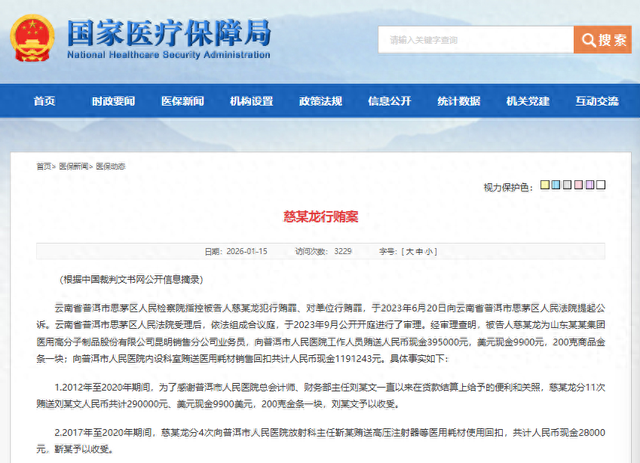 文章核心观点 - 国家医保局通报了山东威高集团医用高分子制品股份有限公司(威高股份)昆明销售分公司业务员慈某龙的行贿案 该案件揭示了医药行业长期存在的系统性商业贿赂问题 行贿行为横跨2011年至2020年 涉及医院多个层级和科室 旨在通过不正当利益影响采购和处方 干扰公平竞争 [1][6][7] 案件涉及公司与人员 - 行贿主体为山东威高集团医用高分子制品股份有限公司(威高股份)昆明销售分公司的业务员慈某龙 [1][7] - 受贿方为云南省普洱市人民医院的多名工作人员及内设科室 包括总会计师/财务部主任 放射科主任 眼科原护士长 以及产科 感染科 呼吸内科 急诊科 泌尿外科 内分泌科 普外烧伤科 手术麻醉科 消化内科 心胸外科 血液风湿免疫科 肿瘤科 重症医学科 康复科 儿科等多个科室的护士长 副护士长及护理人员 [1][2][3][4][5] 行贿事实与金额 - 慈某龙向普洱市人民医院总会计师/财务部主任刘某文行贿 以换取货款结算便利 在2012年至2020年间分11次贿送人民币29万元 美元9900元(约合人民币6.3万元 按当前汇率估算)及200克金条一块 [1] - 慈某龙向医院多个内设科室贿送医用耗材销售回扣 总额为人民币1,191,243元 [1] - 具体行贿事实共计19项 时间跨度从2011年至2020年 涉及静脉留置针 超低密度精密输液器 高压注射器 避光输液器等多种威高股份产品 单笔行贿金额从人民币1.4万元到40.82万元不等 部分还包括面值50元的超市购物券 [1][2][3][4][5] - 其中 向儿科护士长等人行贿金额最高 达人民币408,200元及面值50元的超市购物券500张(价值2.5万元) [5] - 消化内科护士长李某波在2019年因担心被查处 向慈某龙退还了人民币35,000元 [4] 案件判决与监管表态 - 慈某龙被判犯行贿罪和单位行贿罪 合计被判处有期徒刑2年6个月 并处罚金20万元 [10] - 国家医保局指出 医药商业贿赂会干扰正常诊疗 妨碍公平竞争 加重患者医药负担 使销售行为被高返点和高回扣驱动 [6] - 国家医保局表示 近期各地已开展输液器 针类医用耗材的集中带量采购 以挤掉价格虚高空间 下一步将指导云南省医保局对失信企业开展信用评价并采取约束措施 [10] 案件信息来源 - 案件信息来源于国家医保局通报以及中国裁判文书网 相关判决由云南省普洱市思茅区人民法院于2023年9月19日作出 并于2024年12月16日公示 [9]