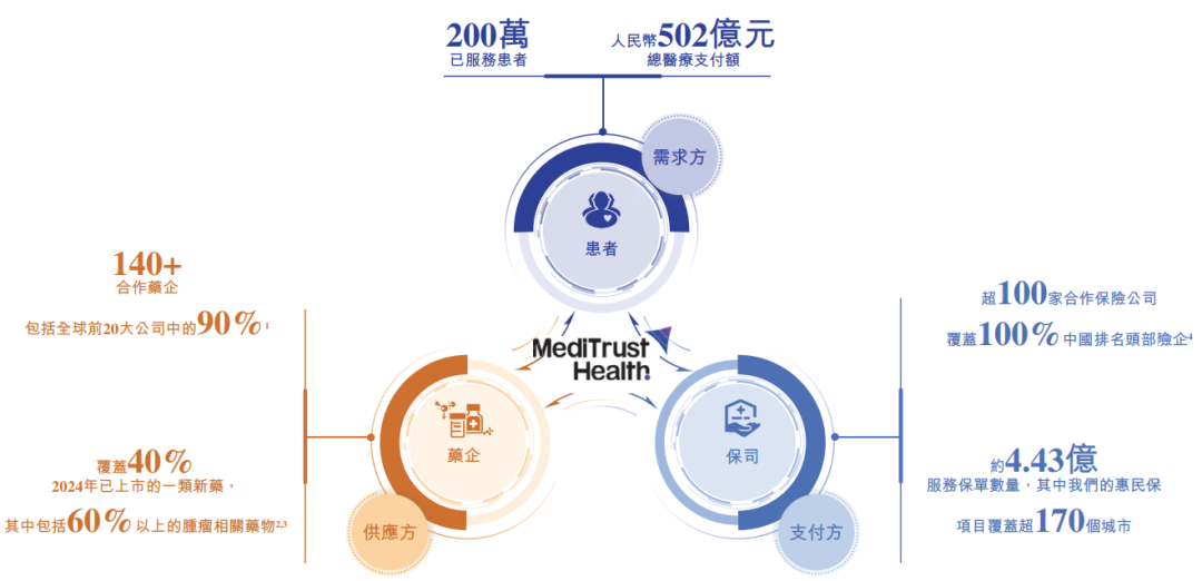 公司概况 - 公司于2017年成立,是中国最大的医药多元支付平台,致力于解决医疗支付体系挑战 [2] - 截至2024年12月31日,累计为患者节省自付费用约67亿元 [2] - 完成IPO前最后一轮融资后估值为116.775亿元人民币 [1][11] 业务模式 - 开发两大行业解决方案:智药解决方案(药品全生命周期商业化)和智保解决方案(健康险创新) [2] - 智药解决方案以2024年GPV计算在中国创新药械解决方案提供商中排名第一 [2] - 智保解决方案以2024年服务保单数量计算为规模最大的创新健康保险解决方案提供商 [2] 客户覆盖 - 截至2024年12月31日,累计服务约160万名患者,医疗支出GPV达397亿元 [4] - 合作超过90家保司(包括中国前20大保司)和超140家药企(覆盖全球前20大药企的90%) [4] - 2024年覆盖40%中国已上市的1类新药,包括60%以上肿瘤相关药物 [4] 消费者平台 - 构建一码直付平台,定位一站式综合医疗平台,截至2025年6月23日注册用户超150,000位 [5] 基础设施 - 三大关键基础设施:mind42.ai(AI中枢)、MediTrust Rx(医疗供应链)、MediTrust Healthcare(诊疗优化) [6] 财务表现 - 2022-2024年营收分别为10.69亿元、12.55亿元、20.35亿元,毛利率分别为31.1%、36.8%、35.8% [7] - 同期经调整净亏损分别为4.47亿元、2.90亿元、0.80亿元,净亏损率从41.8%收窄至3.9% [8] 行业前景 - 中国创新药械市场规模从2019年923亿元增至2024年1,620亿元(CAGR 11.9%),预计2030年达4,102亿元(CAGR 16.7%) [9] - 中国商业健康险市场规模从2019年7,066亿元增至2024年9,773亿元(CAGR 6.7%),预计2030年达23,568亿元(CAGR 15.8%) [9] 融资与股权 - 累计完成7轮融资,总规模约31.57亿元,投资方包括上海医药集团、蚂蚁集团等知名机构 [10] - IPO前上海医药集团(10.72%)和蚂蚁集团(10.63%)为前两大机构股东 [10] IPO计划 - 拟港股主板上市,高盛、中金、汇丰担任联席保荐人 [1] - 募资用途包括扩展药企及保司服务、升级一码直付平台、强化基础设施、战略投资等 [11]
