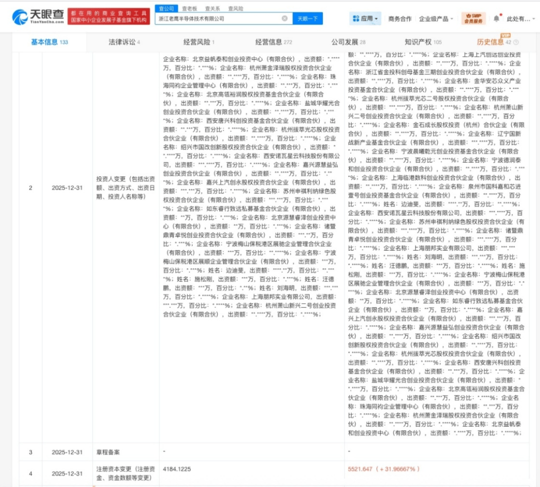 公开信息显示,老鹰半导体是一家专注于新型半导体材料设计、VCSEL芯片研发及封装的国家高新技术企业,产品应用于光互连、自动驾驶及消费电子 等领域。 | 宜公司 查老板 童关系 查风险 | 任用的需求更加工具 | 浙江老鹰半导体技术有限公司 | 船 应用 · | 商务合作 企业级产品 - | 此处有 ... · | 天眼一下 | (23 | 要中介企业发展子基金加下机构 | | --- | --- | --- | --- | --- | --- | --- | --- | --- | | 法律诉讼 4 | 经营风险 1 | 经营信息 272 | 公司发展 28 | 知识产权 105 | 历史信息 42 ⑦ | 133 | 酸:".""万,自分比:"."""%;企业名称:上海上汽创远创业投资 | | | 企业名称:北京益帆泰和创业投资中心(有限合伙),出资额:" …… | 合伙企业(有限合伙),出资额:".""万,百分比:*."""%;企业 | 万,百分比:".""%;企业名称:杭州萧金泽瑞股权投资合伙企业 | 名称:浙江省金投科创母基金三期创业投资合伙企业(有限合伙), | | | | | | | (有限合伙) ...