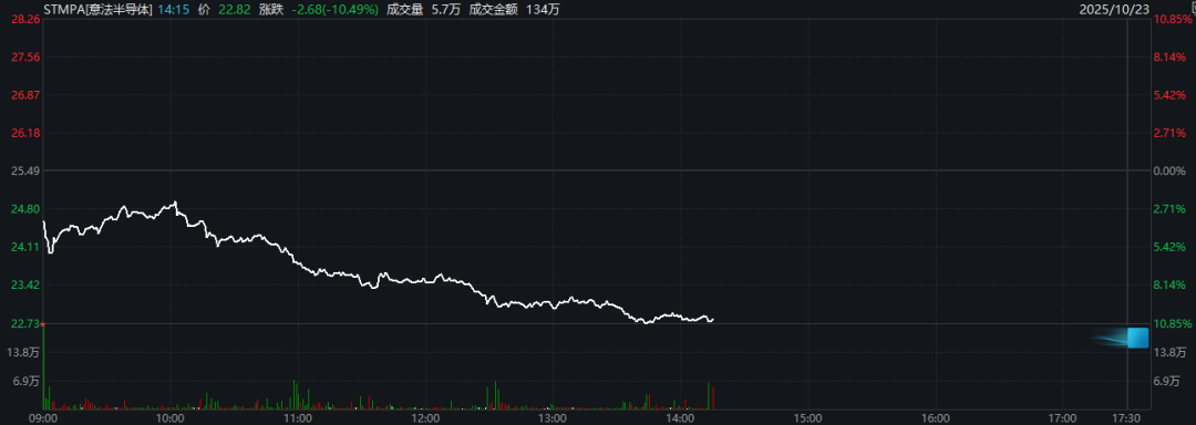 股价表现 - 10月23日,意法半导体美股股价暴跌超10% [3] - 其美股最新价为25.75美元,下跌3.37美元,跌幅达11.56% [5] - 在米兰交易所的股票在下跌8.55%后触发暂停交易,随后跌幅扩大至12% [5] 业绩与财务表现 - 公司预计第四季度营收为32.8亿美元,低于分析师平均预期的33.5亿美元 [9] - 上季度营收同比下降2%至31.9亿美元 [9] - 上季度营业利润下滑53%至1.8亿美元,低于预期 [9] - 上季度业绩包括与此前宣布的降本计划相关的资产减值与重组费用共3700万美元 [9] - 上半年产量较低导致制造效率受损,压制了利润率 [10] 行业与市场环境 - 公司第四季度营收指引不及预期,显示备受期待的半导体行业复苏或现疲态 [8] - 用于汽车和工业机械的半导体需求复苏所需时间比许多人预期的更长 [8] - 自年初以来,随着特朗普发起贸易战并威胁开征广泛关税,芯片行业一直承压 [9] - 竞争对手德州仪器发布的业绩展望同样令投资者失望 [9] - 客户在日益加剧的贸易紧张与疲弱的经济环境下减少下单 [9] - 不同下游行业需求波动:用于支撑人工智能所需数据中心的半导体需求旺盛,但对工艺相对不那么先进芯片的订单更为低迷 [9] - 汽车芯片供应链正面临严重扰动,荷兰政府近日以史无前例的举措夺取了安世半导体的控制权,其中国工厂暂停向欧洲出口安世产品 [11] 公司战略与展望 - 公司首席财务官预计,随着本季度“更高的营收水平”将“更好地填充产能”,盈利能力会有所恢复 [10] - 公司将把今年净资本开支缩减至低于20亿美元,“以便在当前市场环境下优化投资” [11]