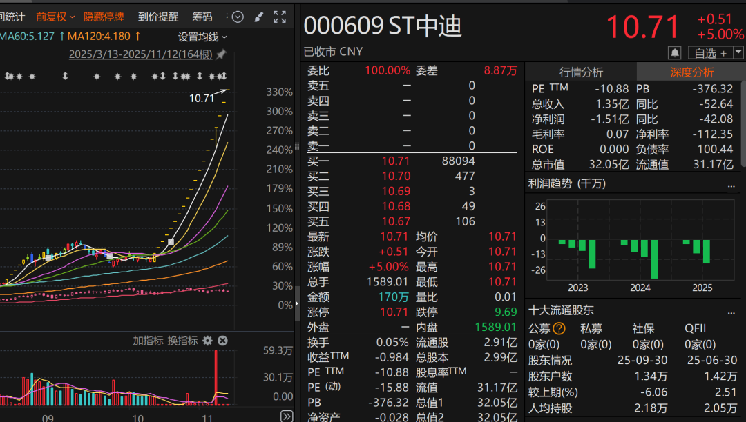 股票交易与股价表现 - 公司股票自10月16日至11月12日价格涨幅为153.19% [1][6] - 公司股票自10月17日起连续录得19个涨停板,最新市值为32.05亿元 [4] - 因股价波动较大触发异常波动,公司股票自11月13日开市起停牌核查,预计停牌时间不超过3个交易日 [2][6] 控制权变更 - 深圳天微投资合伙企业(有限合伙)于10月17日通过司法拍卖以2.55亿元底价竞得公司原控股股东持有的全部23.77%股份,并于11月7日完成过户 [2][6][8] - 天微投资成立于2025年7月22日,由门洪达、张伟各持股50%,二者是拟上市公司深圳市天微电子股份有限公司的董事长及副董事长 [2][6][8] - 拍卖过程极具戏剧性,在第二次拍卖截止前仅6分钟,天微投资才突然出手以底价竞得该标的 [7] 新控股股东背景 - 新实际控制人门洪达和张伟为半导体行业“老兵”,是国家级高新技术企业、专精特新“小巨人”企业深圳天微的共同创始人 [8] - 深圳天微主要从事集成电路设计、封装测试及半导体设备制造,曾于2016年拟挂牌新三板,并于2020年12月进行A股IPO辅导备案 [8] - 深圳天微和天微投资的办公地址及老板一致,但关于为何买下ST中迪控股权的原因尚不清楚 [8] 公司财务状况与退市风险 - 截至2025年三季度末,公司归属于上市公司股东的所有者权益为-851.68万元,同比大幅下降103% [11] - 2025年前三季度营业收入为1.35亿元,同比下降52.64%;利润总额为-1.51亿元,同比下降41.83%;归母扣非净利润为-1.32亿元,同比下降34.12% [11] - 公司子公司重庆中美恒置业有限公司尚有约5.92亿元的银行借款本息未偿付,即使原控股股东股份拍卖所得用于偿还部分债务,仍欠约3.37亿元 [11] - 公司面临对外担保涉诉,可能承担超过1.4亿元的连带清偿责任,全资子公司达州中鑫房地产开发有限公司存在支付1400万元违约金的风险 [11] 未来业务展望 - 市场预期公司这一地产“旧壳”或将迎来半导体“新芯”的注入 [3] - 公司公告明确表示,截至目前,天微投资不存在未来12个月内改变上市公司主营业务或对主营业务作出重大调整的具体计划 [12]