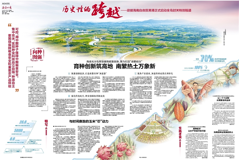 海南充分发挥资源和政策优势,聚力打造"南繁硅谷" 育种创新筑高地 南繁热土万象新 三亚南繁耕地。 海南日报全媒体记者 王程龙 摄 向种图强 在南繁基地,著名育种专家程相文带领团队培育出39个优质玉米品种,选育的"浚单20"荣获国家科技进 步奖一等奖,"浚单"系列玉米品种累计在全国推广3亿多亩,增加社会经济效益270多亿元。 一粒种子,能改变什么? 在三亚崖州湾科技城高新区,由海南省种业实验室培育的田菁种子,播撒在内蒙古自治区的盐碱地上, 有效增强了土壤肥力,一定程度上缓解了当地冬季牧草紧缺问题。 种子是农业的"芯片",其创新突破直接关系国家粮食安全与农业核心竞争力。即将正式启动全岛封关的 海南自由贸易港,聚焦服务国家重大战略,充分发挥自贸港政策优势,持续完善软硬件条件保障,吸引越来 越多的科研工作者投身这片热土,持续探索实现育种技术突破,种业现代化产业集群成型起势,形成发展新 质生产力的新赛道。 A 集聚创新链条,打造南繁育种"加速器" 冬季,三亚崖州区南繁基地的农田里,仍是一片绿海。水稻、玉米、辣椒、黄瓜、圣女果……各种粮食 果蔬作物生机勃勃。种农兰芳涯穿梭在田地间,记录着田间作物的关键参数。"看着种子长成 ...