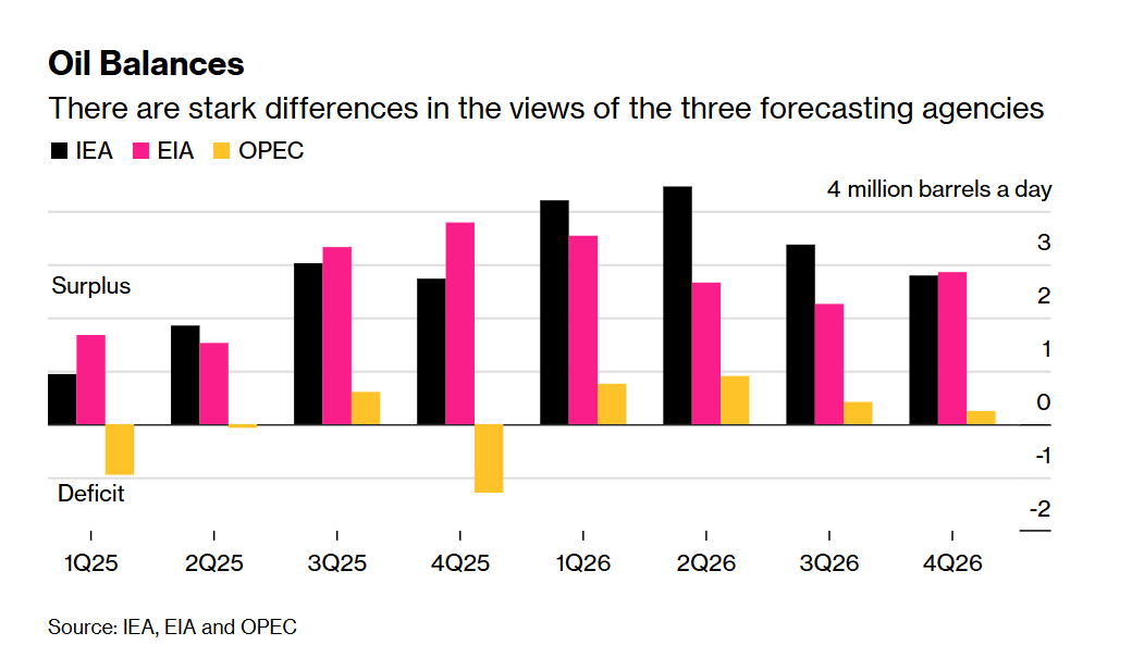 在原油交易商试图研判今年油价走势之际,他们面对的是对市场供需前景截然相反的评估——有人认为会出现巨额供应过剩,也有人认为市场将基本实现 供需平衡,交易商需在不同观点间反复权衡。 全球三大主流能源预测机构——国际能源署(IEA)、美国能源信息署(EIA)与OPEC均已更新2026年预测,三者间的分歧依旧显著,形成了两大消费端 机构与产油国阵营的对立研判格局。 IEA认为市场将出现大规模供应过剩,2026年上半年原油日过剩量将超400万桶,全年平均日过剩量也将突破370万桶;EIA的预判与之相近,预计今年原 油日供应过剩超280万桶,本季度过剩规模将触顶,日过剩量突破350万桶。 与之形成鲜明对比的是,基于OPEC数据的测算显示,原油市场供需将更趋于平衡,今年全年平均日供应过剩量仅约60万桶。 此次最新预测再次印证了三大机构的一贯立场,长期以来,三者对原油市场供需平衡状况的判断始终存在巨大差异。 IEA与OPEC均未对OPEC的产量进行预测,因此对未来市场供需失衡的研判,均需建立在相关假设基础之上。 IEA在其报告中使用当前的OPEC+产量协议作为未来供应的参考,并采用相同的基准对欧佩克数据进行估算。该机构还假设 ...