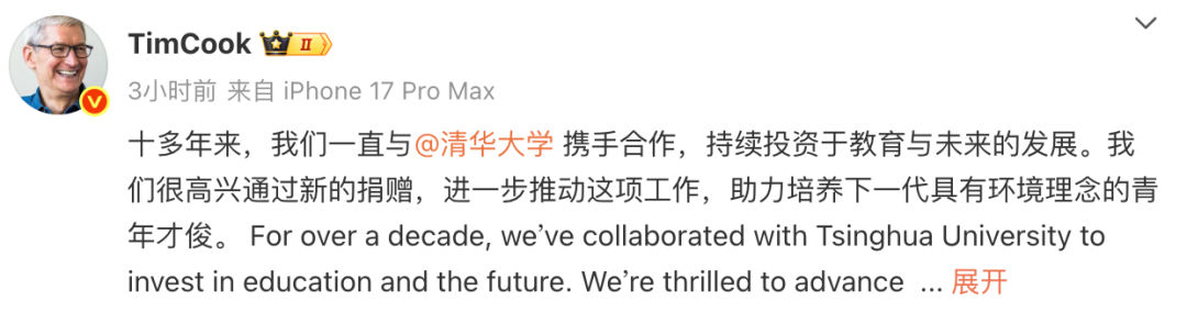 苹果宣布向清华大学提供新捐赠。 10月14日,苹果公司宣布向清华大学启动一项新的捐赠计划。 据悉,此项捐赠将用于设立一项覆盖全校的项目,帮助学生们掌握推动可持续创新所需的知识与技能,以便于在其未来的职业生涯中发挥作用。 苹果CEO蒂姆·库克对此表示,"我们很荣幸能在与清华大学长达十年的合作基础上更进一步,通过学术能力培养与实践经验赋能,助力学子们推动环境事 业的发展。" 库克称,他对新一代年轻人将如何运用创新与协作的力量让世界变得更美好充满期待。 在绿色发展方面,苹果已于2020年在全球实现自身运营的碳中和,目前正稳步推进其2030目标,即到 2030年在整个供应链及所有产品的全生命周期实现 碳中和。作为该目标的重要组成部分,公司正与中国本地合作伙伴协同推进水资源管理、扩大产品中再生材料与可再生能源的应用规模,并加速清洁能源 转型进程。据库克透露,目前苹果在中国超过90%的生产制造已由可再生能源驱动。 昨日,10月13日,库克现身上海,参加LABUBU巡展,与泡泡玛特创始人、董事长兼CEO王宁以及LABUBU之父龙家升合影。当日晚间,他还现身抖音 Apple Store直播间,宣布iPhone Air国行版将 ...