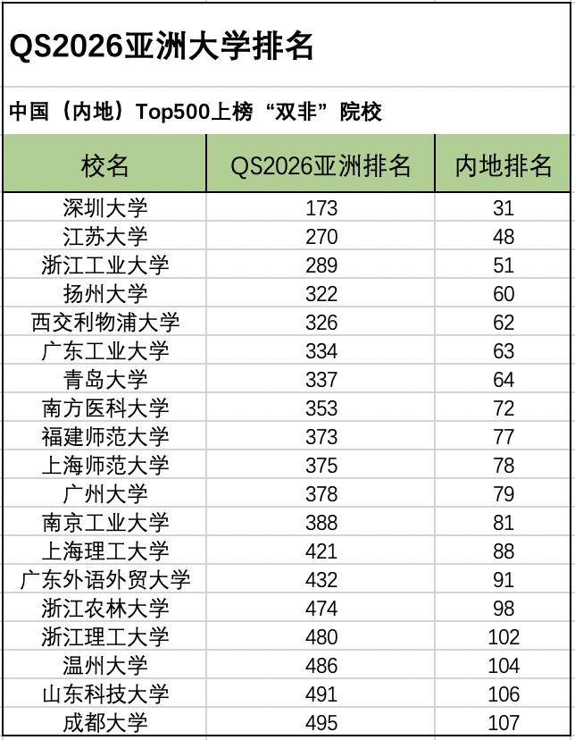 中国内地高校在QS亚洲大学排名的整体表现 - 2026年QS亚洲大学排名中,中国内地高校表现亮眼,多项数据创下新高 [1] - QS排名共收录395所中国内地高校,较去年新增261所,上榜数量增幅位列该地区第一名 [1] - 在去年已上榜的院校中,48所排名上升,7所排名持平 [1] - 中国内地在前50强院校数量上位居亚洲首位,科研成果获国际认可且高校深受雇主青睐 [1] “双非”高校的排名表现与分布 - 共有19所中国内地“双非”高校进入QS亚洲大学Top500,部分学校排名优于部分985、211高校 [2][5] - 进入前500名的“双非”高校多分布于沿海地区,国际化程度普遍较高 [4] - 深圳大学为“双非”高校中的佼佼者,位列亚洲第173名、内地第31名,排名超过部分985高校 [5] - 深圳大学的成功得益于深圳特区区位优势、充沛经费支持及高度市场化科研机制 [5] 重点“双非”高校个案分析 - 深圳大学2025年预算达75.07亿元,位居深圳市高校榜首,与境外315所高校建立合作 [7] - 江苏大学位居亚洲第270名,已与66个国家的256所高校及科研机构建立合作 [8] - 浙江工业大学位居亚洲第289名,已与35个国家的180余所海外高校建立合作 [8] “双非”高校冲击“双一流”的潜力 - 深圳大学、南方医科大学、广东工业大学被广东省重点支持,目标进入国家“双一流”建设范围 [10] - 深圳大学的计算机科学与技术、信息与通信工程、基础医学三个学科均有4项“双一流”监测核心指标达标 [10] - 南方医科大学基础医学与临床医学方向保持领先,临床医学为教育部学科评估A类学科 [11] - 广东工业大学机械工程学科为广东省重点建设学科,工程学进入ESI全球前0.3‰ [11] - 浙江工业大学化学工程与技术学科核心指标“全面达标”,2025年预算高达48.88亿元 [12][14]