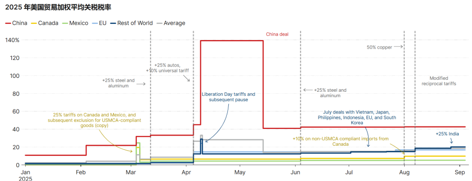 美国整体关税水平与政策背景 - 2024年美国平均进口关税税率约为2.5%,但特朗普上任后签发了一系列复杂关税法令[1] - 截至2025年9月,美国加权平均关税约为18.9%,为二战后的最高水平[32] - 特朗普征收的关税预计在未来十年增加2.3万亿美元收入,同时可能使美国GDP减少0.8%[33] 美国对主要贸易伙伴的关税税率 - 美国对中国的平均加权关税税率最高,为42.6%[16] - 美国对加拿大和墨西哥的平均税率分别为9.8%和5.2%,主要因USMCA协定[6][7] - 美国对欧盟、日本、韩国和英国的平均关税税率分别为16.8%、15.7%、15.2%和13.3%[21] - 美国对东南亚国家加权平均关税:印尼19.7%、越南15.4%、菲律宾14.2%[24] - 美国对印度和巴西的平均加权税率分别为37.7%和31.3%[29] 关键行业关税细节 - 美国对中国特定产品关税:汽车及零部件52.5%,钢铁与铝制品57.5%~80%,铜50%~55%[17] - 美国对加拿大特定产品关税:不符合USMCA的汽车及零部件27.5%,钢铁与铝50%-55%,非USMCA进口36.9%[8] - 美国对墨西哥特定产品关税:不符合USMCA的汽车及零部件27.5%,铜与钢铁铝50%-55%,非USMCA进口28.4%[9] 关税政策对产业链与贸易的影响 - 特朗普关税政策客观上强化了美、加、墨三国产业一体化,出现汽车、电子、医药等"北美闭环"趋势[15] - 日本8月对美出口额同比下降13.8%,且已连续5个月同比下降[23] - 越南表现出较强抗压性,前9个月对美出口同比增长16%,8月、9月对美出口仅下降2%和1.4%[26] - 越南前9个月对美贸易顺差暴增28%至990亿美元,竞争力强于印度、泰国和马来西亚[27] - 越南对美出口表现强劲部分受益于消费电子产品(占出口近三成)享受关税豁免[28] 关税政策的内部矛盾与宏观影响 - 特朗普的关税政策加剧了美国住房成本上涨,例如针对木材、家具、钢铝等领域的关税[36] - 美国绝大多数住宅为木结构,对木材加征关税直接提高了房屋建造成本[37] - 美国的"双赤字"(财政赤字+贸易赤字)模式正显露疲态,其国际角色转向具有不可逆性[41][45][46]