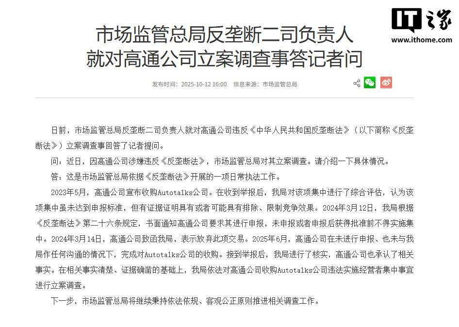 IT之家 10 月 12 日消息,国家市场监督管理总局 10 月 10 日宣布,因高通公司收购 Autotalks 公司未依法申报经营者集中,涉嫌违反 《中华人民共和国反垄断法》(以下简称《反垄断法》),市场监管总局依法对高通公司开展立案调查。 市场监管总局今日发布公告,反垄断二司负责人就对高通公司违反《反垄断法》立案调查事回答了记者提问。IT之家附原文如下: 问:近日,因高通公司涉嫌违反《反垄断法》,市场监管总局对其立案调查。请介绍一下具体情况。 答:这是市场监管总局依据《反垄断法》开展的一项日常执法工作。 2023 年 5 月,高通公司宣布收购 Autotalks 公司。在收到举报后,我局对该项集中进行了综合评估,认为该项集中虽未达到申报标 准,但有证据证明具有或者可能具有排除、限制竞争效果。2024 年 3 月 12 日,我局根据《反垄断法》第二十六条规定,书面通知高 通公司要求其进行申报,未申报或者申报后获得批准前不得实施集中。2024 年 3 月 14 日,高通公司致函我局,表示放弃此项交易。 2025 年 6 月,高通公司在未进行申报、也未与我局作任何沟通的情况下,完成对 Autotalks 公司 ...
