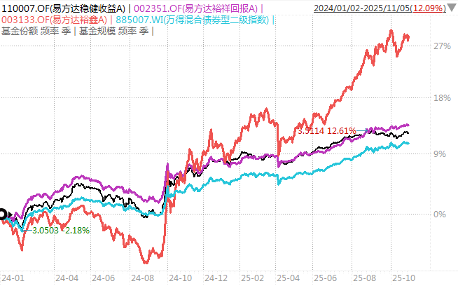 行业规模与产品趋势 - 2025年第三季度,二级债基基金份额增长3747亿份,增幅达56.9%,显示投资者正借道“固收+”产品入市 [1] - 行业呈现传统大厂与新锐黑马并进的特征:易方达基金二级债基规模从988亿元增至1280亿元,增加292亿元;中欧基金与永赢基金规模合计增长约290亿元,中欧基金行业排名第5,永赢基金排名第11 [2] - 产品策略呈现低波动与高波动“固收+”并进的特征:以易方达为例,其三季度有三只基金规模增长超50亿元,其中易方达稳健收益(增99亿元)和易方达裕祥回报(增59亿元)偏稳健,易方达裕鑫(增59亿元)偏高波 [3] 基金管理公司优势分析 - 配置型产品(如二级债基)优选大厂,因债券投资依赖平台能力且大厂风控严格,能从源头抑制风险 [4] - 大厂人才梯队建设成体系,例如易方达拥有胡剑、张清华、张雅君等资深基金经理及杨康、林虎、胡文伯等新生力量,并是国内最早布局多资产团队的基金公司 [4] 具体产品与基金经理分析 - 易方达裕鑫基金规模从去年四季度的8亿元增长至今年三季度的89亿元,增幅达10倍,其半年报显示机构持有比例超过90% [4][5] - 基金经理胡文伯的投资原则之一是相信均值回归,例如在2024年一季度逆势加仓可转债,仓位从8.4%提升至14.82%,并在三季度增至45.49%,之后几个季度均保持在40%以上 [6][8][9] - 胡文伯在三季度操作中减仓科技、加仓消费,理由是科技板块大涨后质量与成长分化剧烈,基于质量因子和均值回归考量进行调整 [11] - 其另一投资原则是构建“反脆弱”组合,寻求在随机事件冲击中获得有利结果大于不利结果,例如在三季度末将可转债仓位从42.7%进一步提升至48.25%,因可转债估值整体不夸张且拥有对波动的反脆弱性 [13][15] - 易方达裕鑫过去一年收益率20.52%,排名同类前4%;今年以来收益率17.44%,排名同类前4% [17]