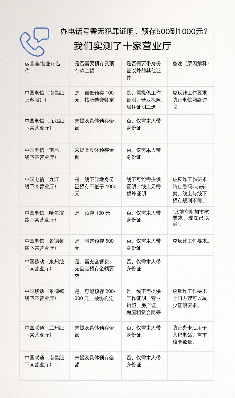 运营商办卡审核标准差异 - 不同地区、不同运营商的线下营业厅对新办电话卡的审核标准存在显著差异,部分仅需本人携带身份证即可办理,部分则要求提供额外证明或预存话费 [1][2] - 中国电信在南昌的线上客服要求最低预存100元话费,并需提供工作证明、营业执照或居住证明三选一 [2] - 中国电信在九江的线下营业厅对异地身份证办理要求预存不低于1000元话费,且线下可能需提供证明 [2] - 中国电信在景德镇的线下营业厅要求固定预存500元话费 [2] - 中国移动在景德镇的线下营业厅可能要求预存200-300元话费,并需提供工作证明、营业执照、房产证或房屋租赁合同等 [2] 地域性政策加码 - 实测发现江西多地办卡门槛明显"加码",而福建、甘肃、黑龙江等地异地办卡门槛相对宽松 [3] - 福建泉州中国移动对外地身份证办卡无区别对待,仅需本人带身份证并按套餐充费 [4] - 甘肃兰州中国联通仅需口头确认不打营销电话并核查名下卡数量,无预存要求 [4] - 黑龙江哈尔滨中国电信需固定预存100元,仅需本人身份证,且此前附加的审核要求已取消 [4] - 即便本地户籍在江西部分电信营业厅办卡,也可能被要求提供工作证明、社保证明、无犯罪记录证明或银行流水之一 [4] 政策依据与监管回应 - 多个营业厅工作人员以"落实反诈工作"为由解释额外的办卡要求 [4] - 多数运营商客服或工作人员无法提供对应的具体政策文件,南昌电信客服表示未看到详细文件,景德镇移动客服提及是工信部规定但无法提供具体条款 [4] - 专家指出,要求"无犯罪证明"、"房产证/居住证"、"预存款500-1000元"等额外条件,目前暂无全国统一法规明确授权运营商必须执行 [5] - 江西省通信管理局已针对媒体报道的问题发布通报,责成相关企业全面开展排查整改 [5]