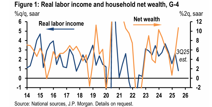 不止AI有"闭环",美国经济也正运行在一个非典型的"闭环"之中:企业通过裁员降本增效推高股价,而飙升的股市通过财富效应刺激消费, 强劲的消费反过来又支撑了企业业绩和经济韧性。 宏观趋势博客作者兼经济学家David Woo将此现象描述为一种索罗斯式的"反身性"闭环。据华尔街见闻此前提及,他警告称,这种由企业裁 员、股价上涨和消费支撑共同构成的循环正在催生泡沫,一旦以AI为首的股市热潮退去或消费者信心崩溃,其脆弱的平衡可能被打破。 摩根大通4日的最新研究则为这一现象提供了数据支撑。该行分析师Joseph Lupton和Maia G Crook在一份报告中指出,当前市场呈现出一 种"奇怪的脱钩"——劳动力市场普遍恶化与家庭财富强劲增长同时发生。这种脱钩在发达市场中普遍存在,但在美国表现得尤为突出。 摩根大通认为,由股价上涨带来的"财富效应"正充当着一座桥梁,暂时弥补了劳动收入增长放缓带来的缺口。然而,分析师们也强调,这种 由资产价格驱动的消费韧性难以长期持续。他们警告,一旦财富效应减弱,股市可能从经济的"缓冲垫"迅速转变为加剧下行压力的"放大 器"。 罕见脱钩:财富增长抵消薪资疲软 摩根大通的报告详细描述了劳动力市 ...