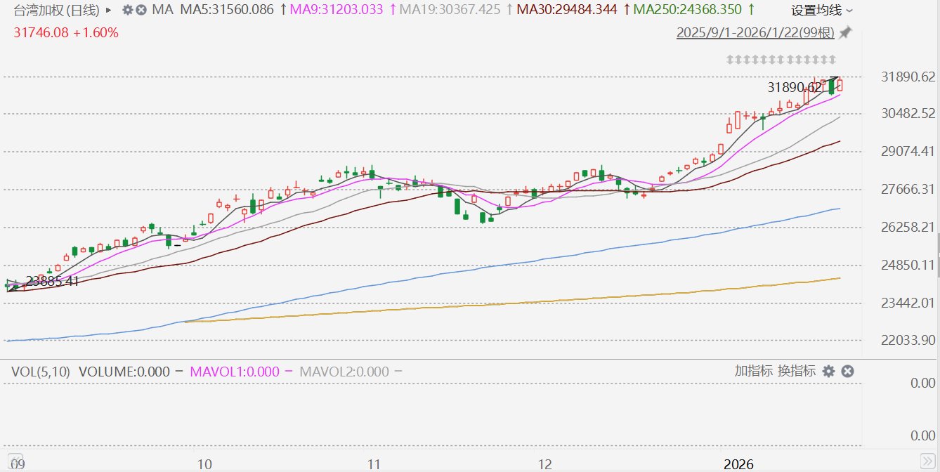 格隆汇1月22日|台湾加权指数盘中一度涨2%报31890.62点,再创历史新高;最终收涨1.6%报31746.08点。 ...