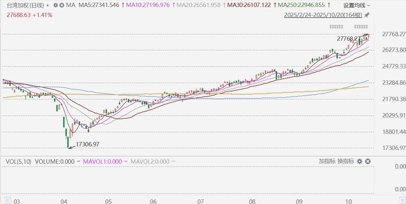 台湾加权指数收涨1.41%报27688.63点,再创收盘历史新高!台股年内累涨20.2%